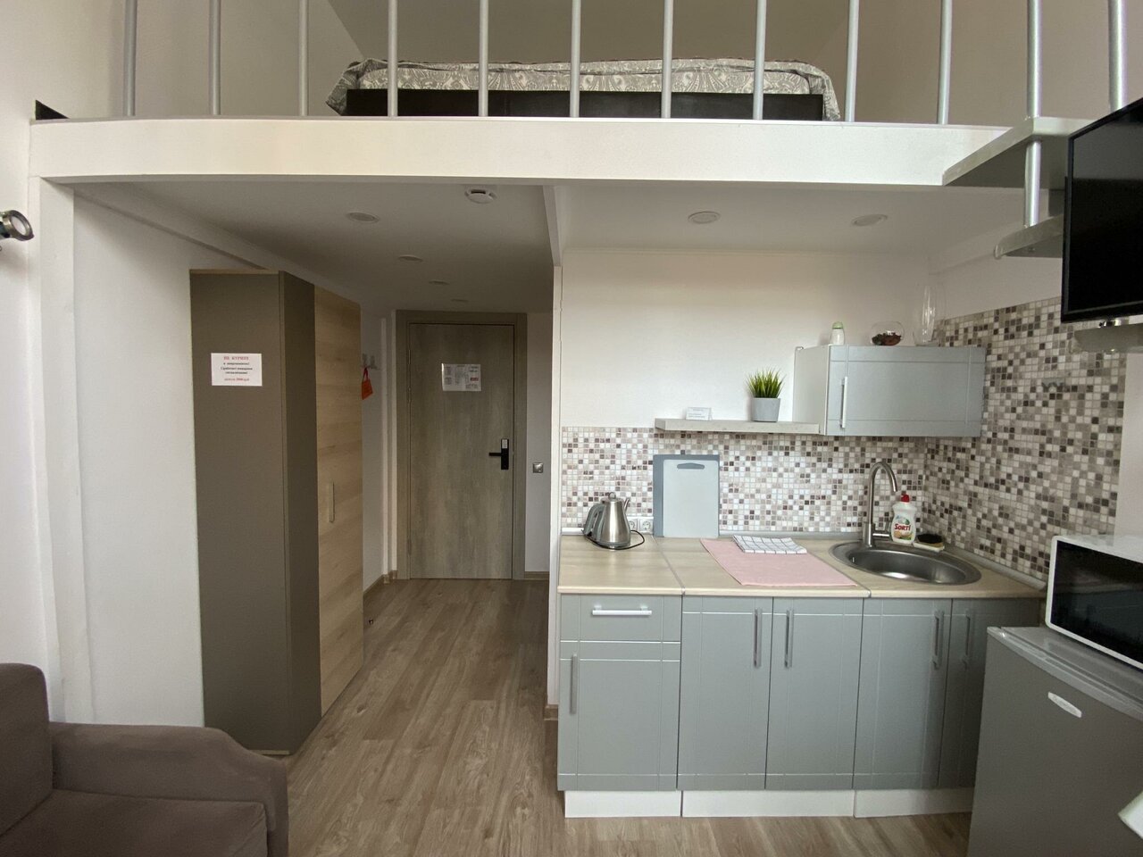 - Комфортные мини-апартаменты с необходимыми удобствами (туалет, душ, фен, полотенца, шкаф, стол, кухня, чайник, холодильник, микроволновка, телевизор, кровать).
