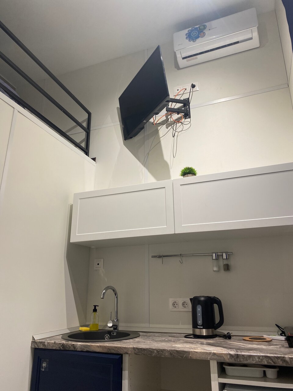 Идея отеля хорошая, выглядит современно, но делали номера халтурно. Самый главный минус: Слышимость( мы слышали и интим и караоке и болтовню и громкие сливы канализации насоса) Минус чистота Минус в студиях не продуманы средства удобства (кухонные тряпки, полотенце) В ванне волосы в сливе, шторке в ванной будто много лет , как и то, на чем она висит. Если не обращать внимание, может на пару ночевок сойдет. Но я больше не вернусь. Такую идею, если добить качественно, был бы супер отель, но все так на отвали сделано. Но было бюджетно, как говорится дорого да мило, дешево да гнило