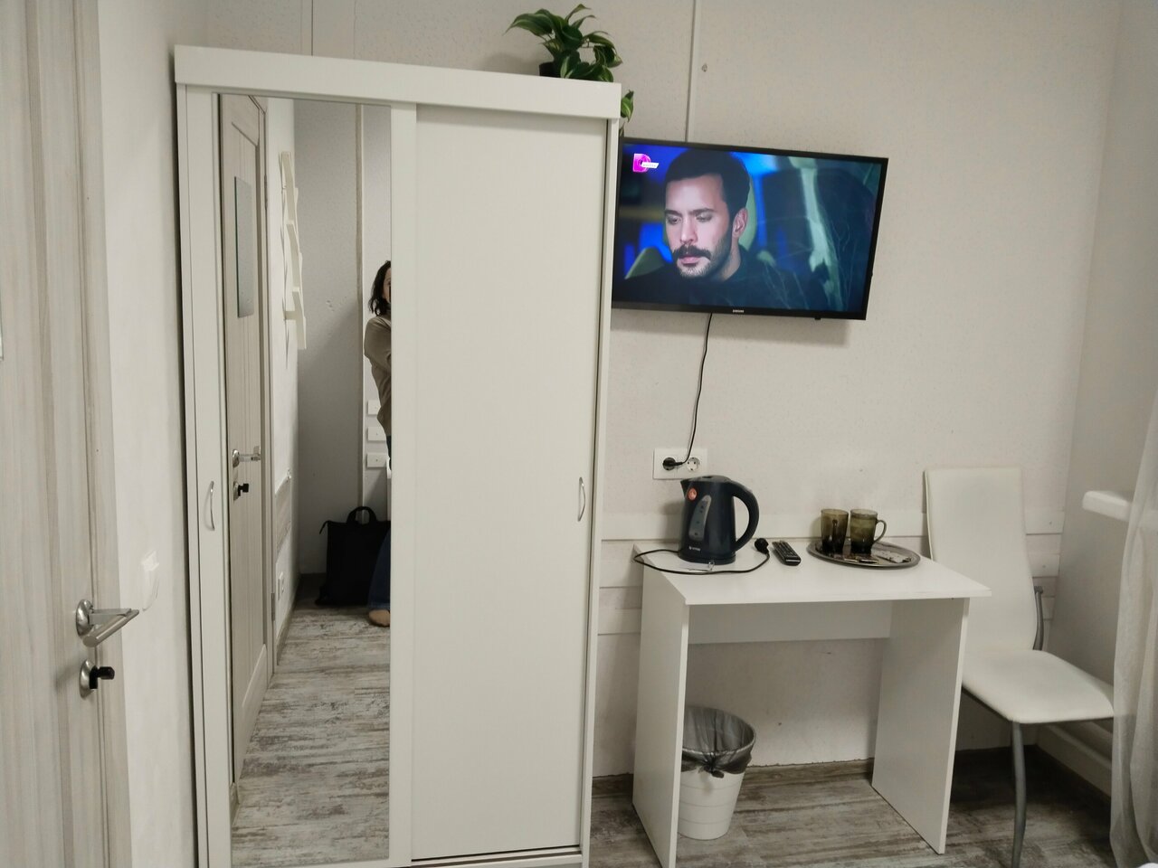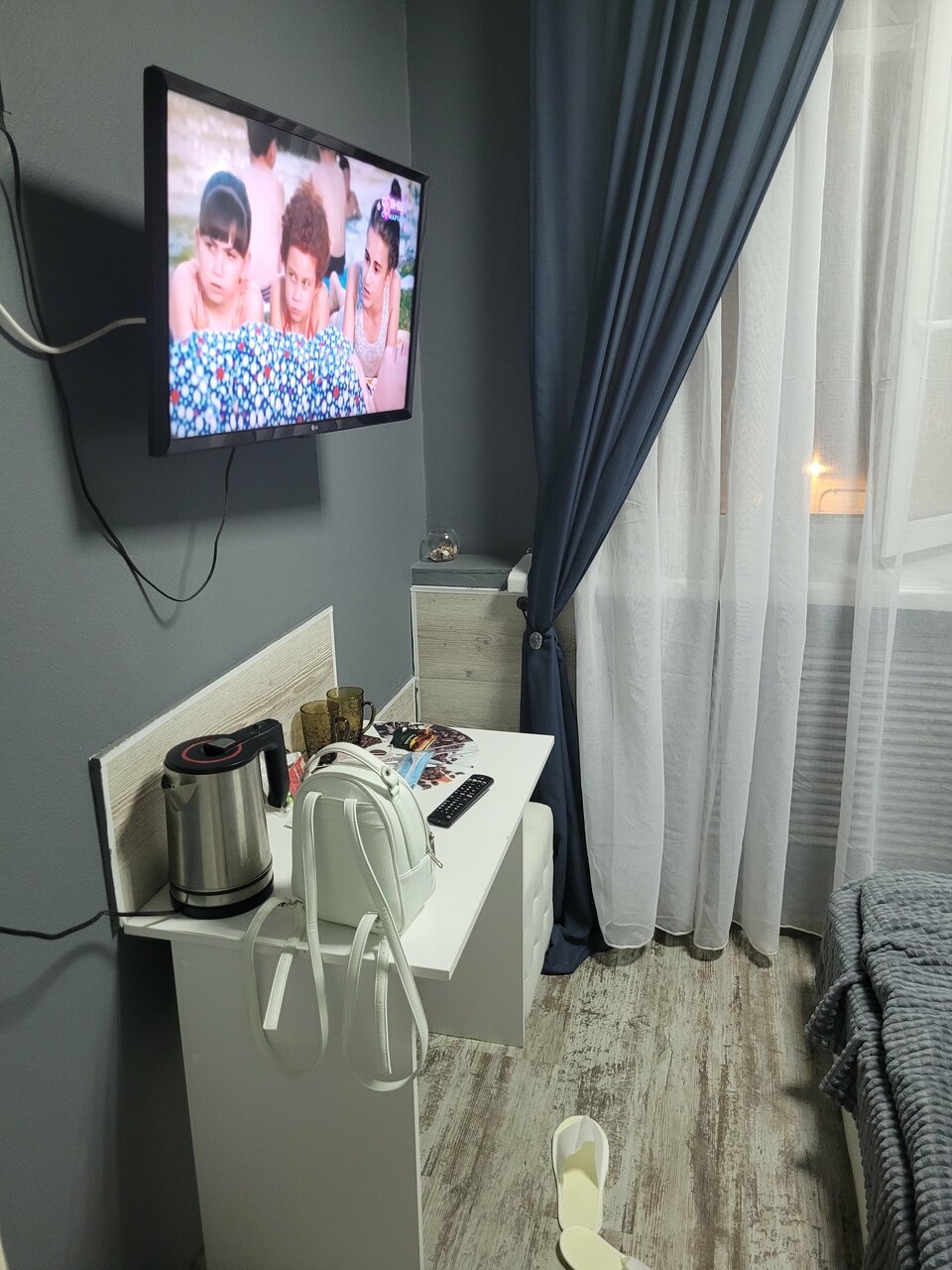 - Уютные номера с вешалками, ящиками, телевизором и чайником.
