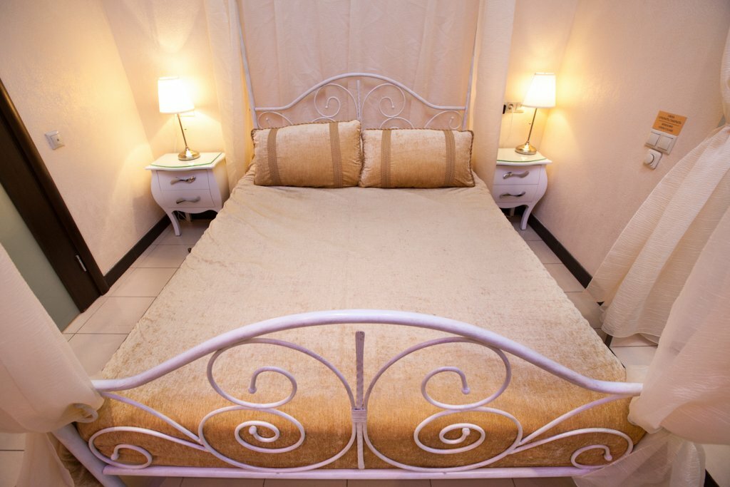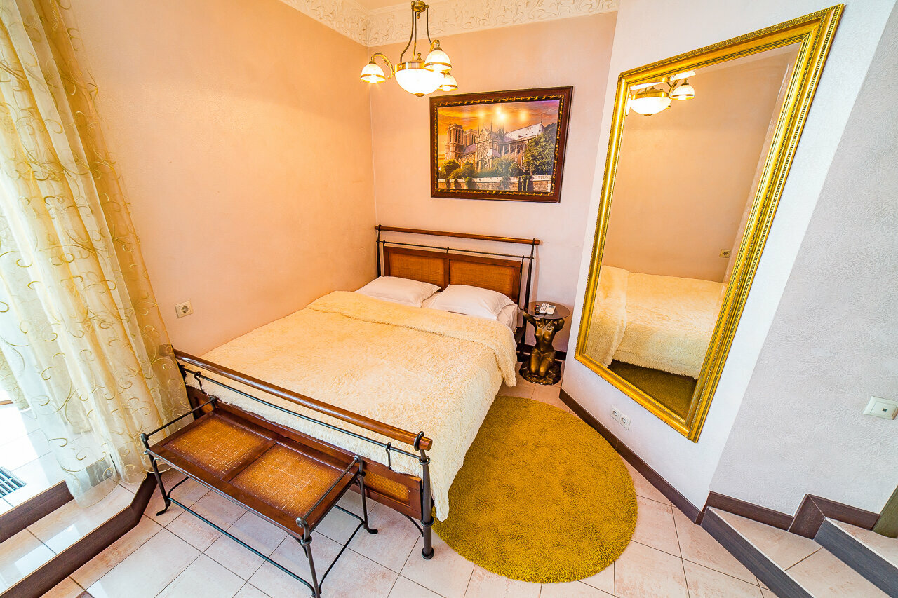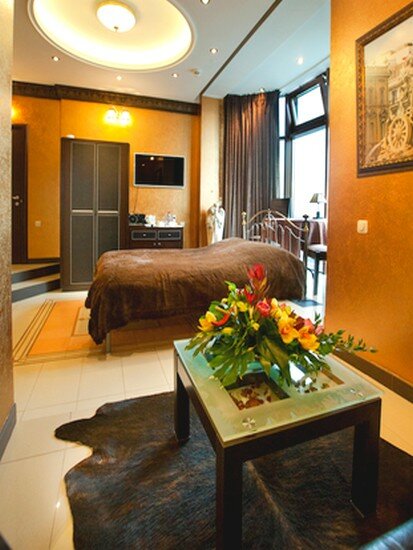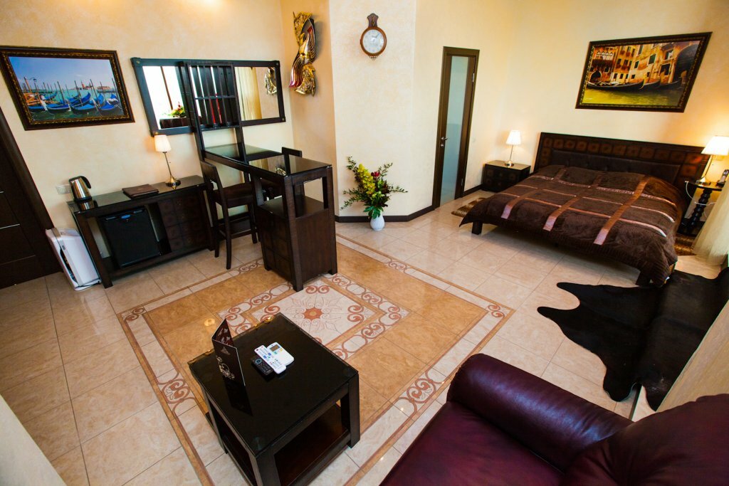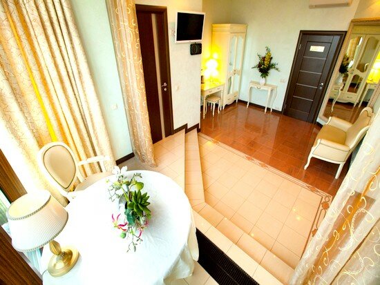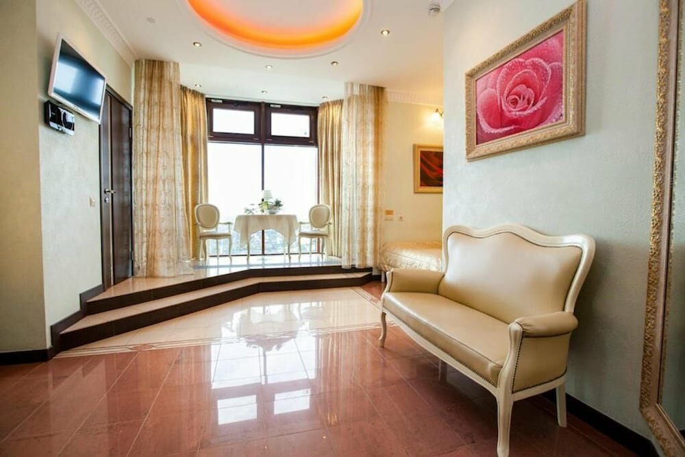 Каждый номер имеет индивидуальный дизайн и оснащен всем необходимым для полноценного отдыха и комфорта. В номерах Люкс по два панорамных окна. Возле одного из них располагается ванна. Цена указана ОТ. Побробнее при бронировании
