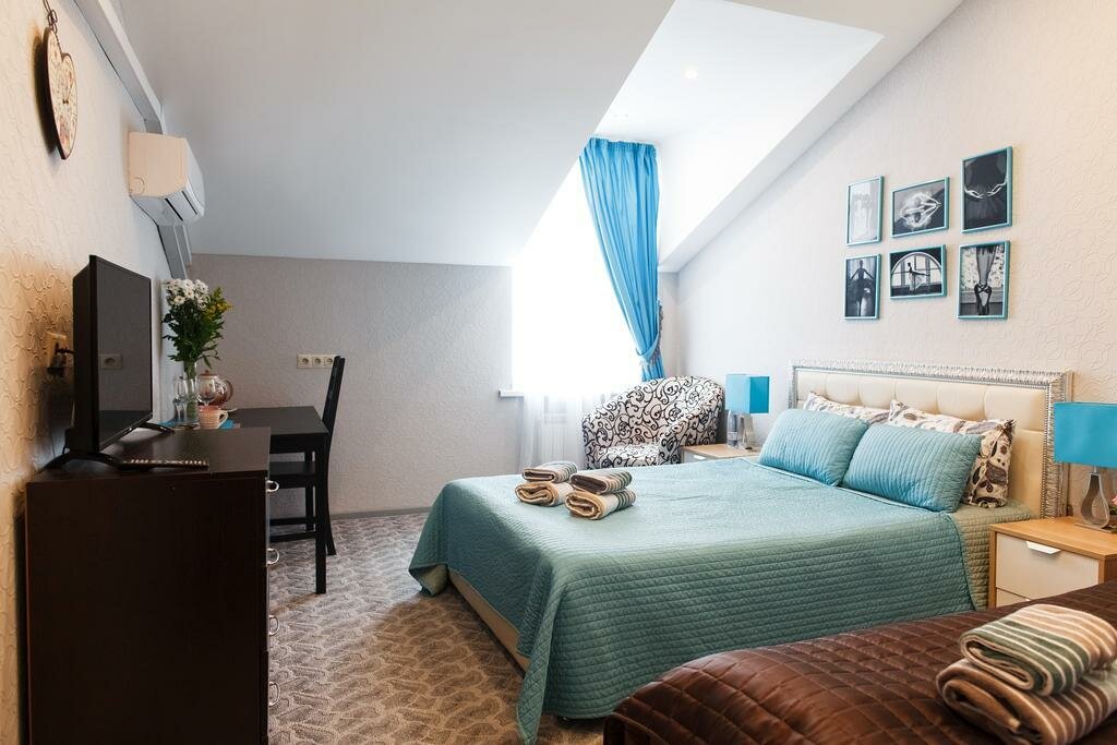 Современный, уютный номер с двуспальной кроватью. Континентальный завтрак (чай, кофе, выпечка) включён в стоимость.