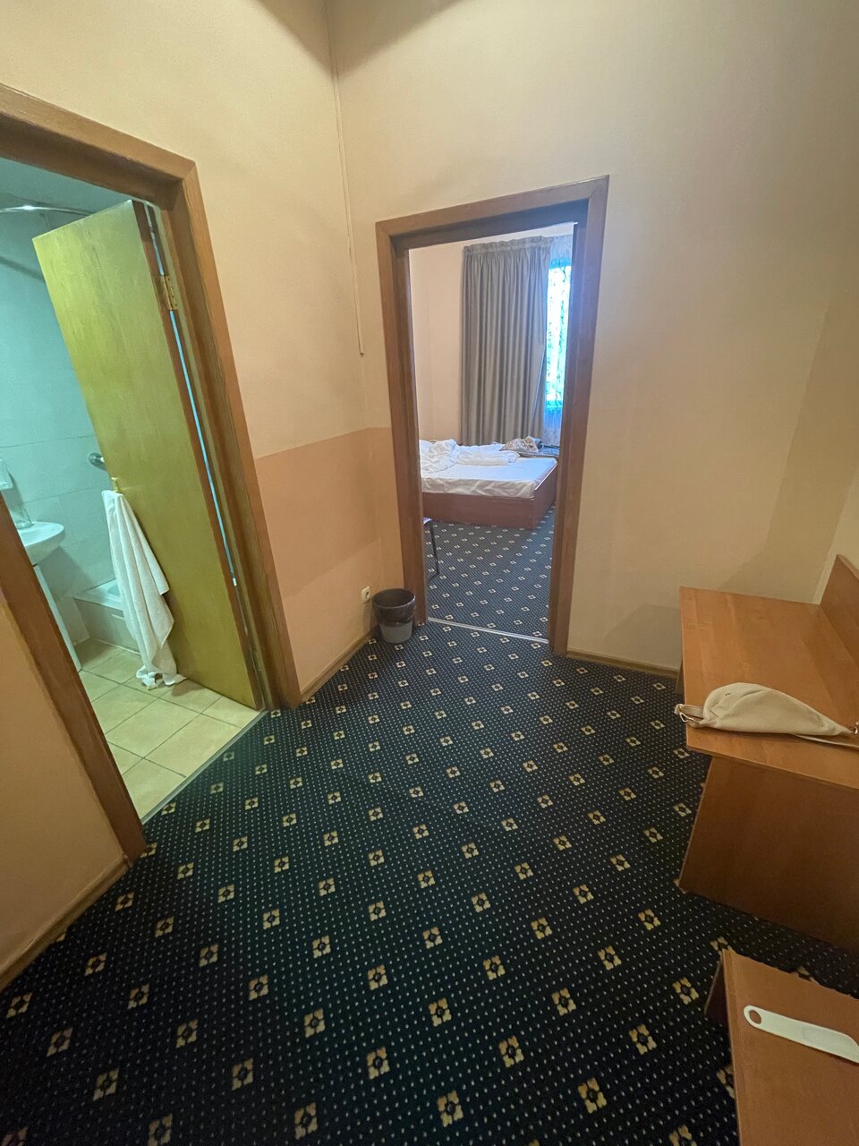 Отель ужасный! Уборка в номерах проводится ужасно, мусор выбрасывают только если он уже выпадает из мусорного ведра. Полотенца меняют после того, как несколько раз попросил их заменить грязные полотенца. Жил в номере 301. Однажды, открывая дверь, выходя из номера, эта самая дверь упала!!! Упала на меня, вместе с дверной коробкой, потому что она держалась только на монтажной пене!!! Столовая на первом этаже- это вообще отдельная статья! Жили в отеле 10 дней, за это время в столовой ни разу не мыли столы, не убирали пол… На полу были горы еды, которую дети роняли на пол… Столовые приборы грязные, тарелки и кружки все с отколотыми краями))) в общем, довольно спартанские условия, прямо ностальгия по службе в армии)))
