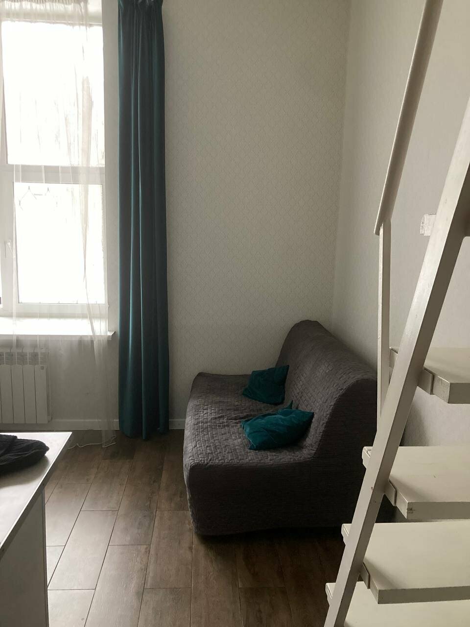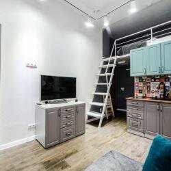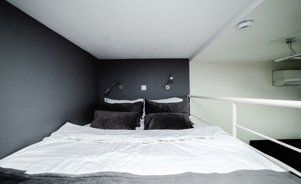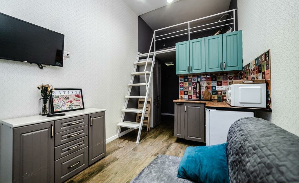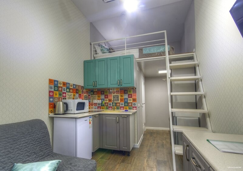 Апартамент трехместный. 12 м2. Двухспальная кровать 160*200 на втором ярусе. В гостиной зоне раскладывающаяся софа.Профессиональная уборка перед каждым заездом гостей.Бесплатный Wi-Fi и парковка