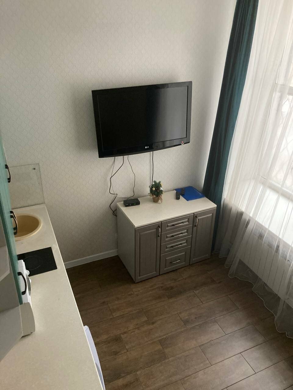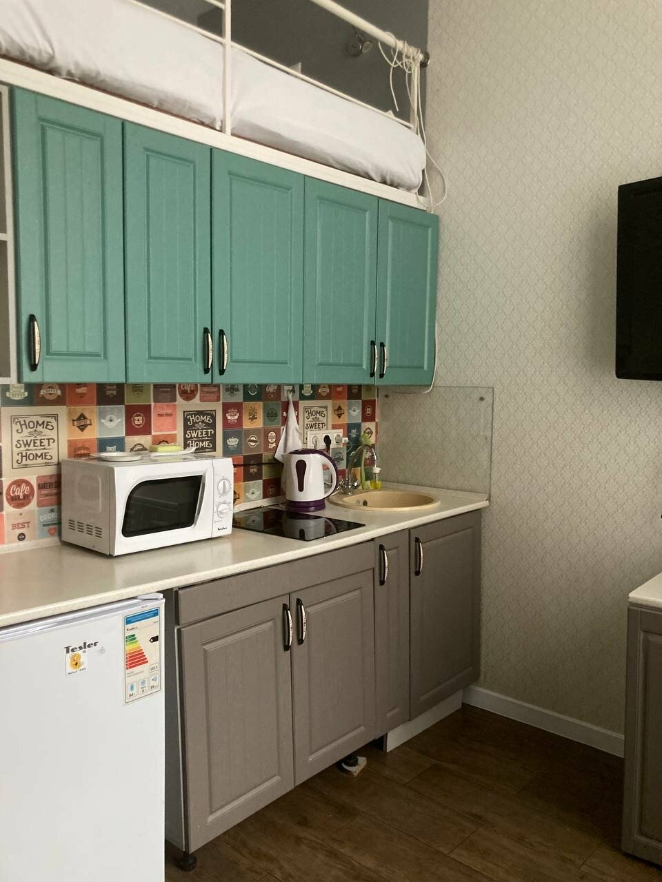 Хорошее место. Все копактно, но есть. Неожиданно хорошая вентиляця и в помещении и в санузле. Зона душа большая, что очень удобно. Не надо ни каких акробатических фигур выделывать, что бы мыться не в облипку с занавеской. Было бы не плохо, что бы изредка хозяева забирали из номера посуду и мыли е в посудосоечной машине. Посуда моется только гостями и по этому чистота тарелок и вилок оставляет желать лучшего. Очень сильный не приятный запах в шкафу над мойкой в сушильном отделении для посуды. Решается проблема закрытием шкафа имойкой всей посуды с хранением в другом месте. Из приятных плюсов кофе от заведения.
