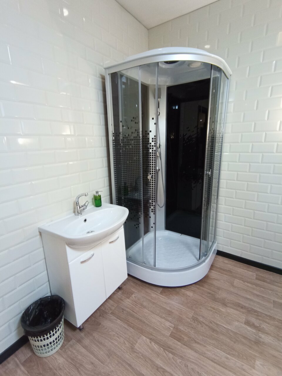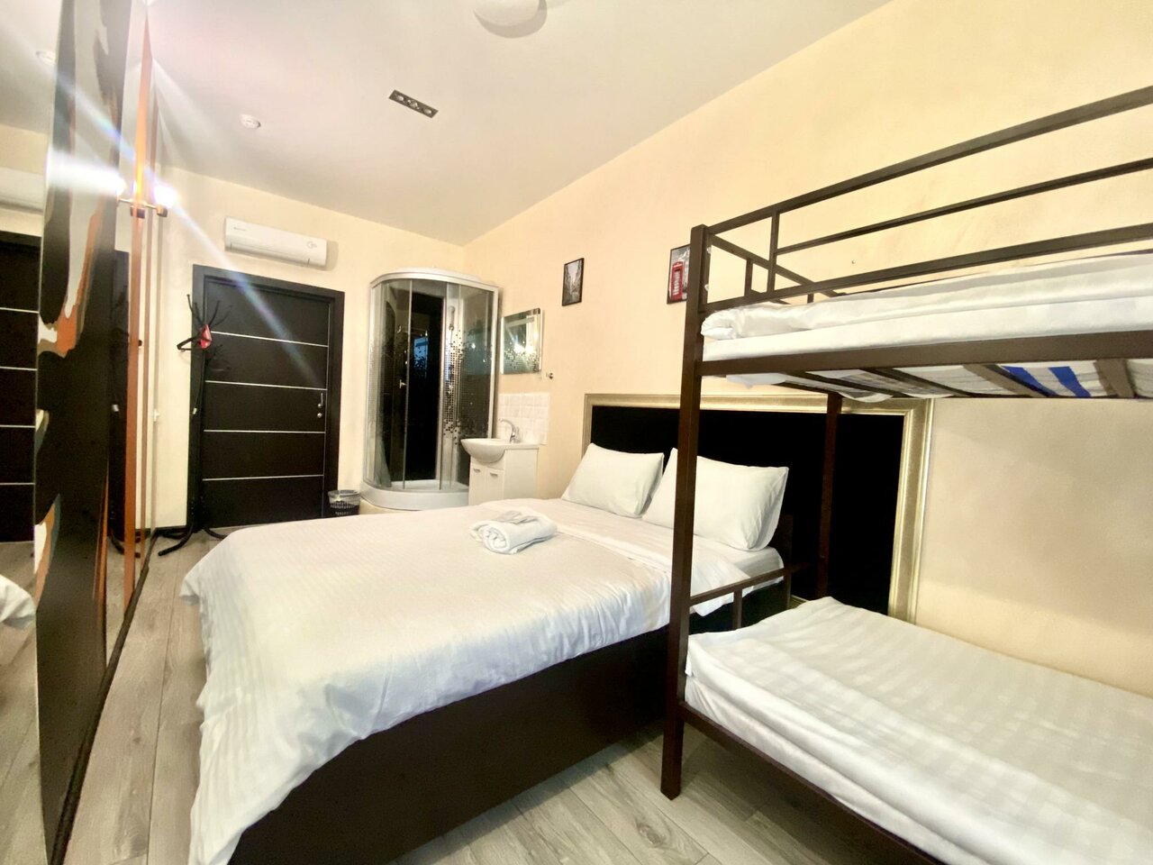 Семейный номер с душевой кабиной для четверых гостей. Стоимость проживания 1 гостя - 3300₽, 2 гостя - 3800₽, 3 гостя -4000₽, 4 гостя -4200₽