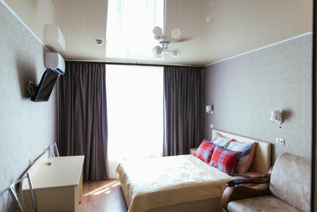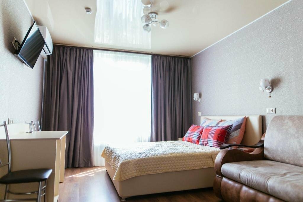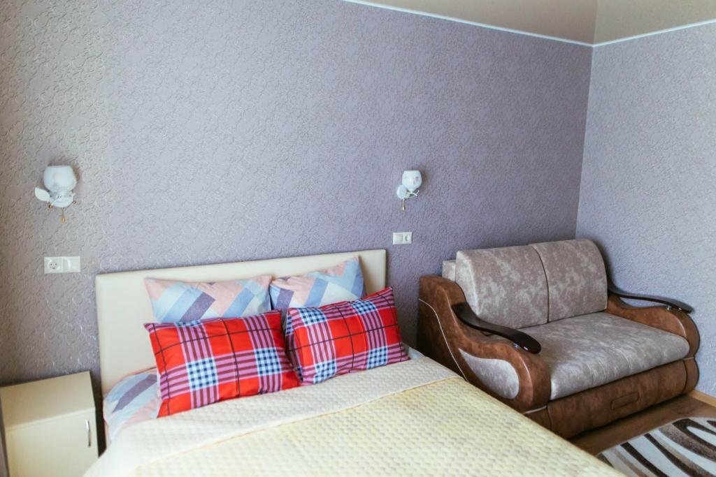 - В номере есть душ, двуспальная кровать, раскладной диван.