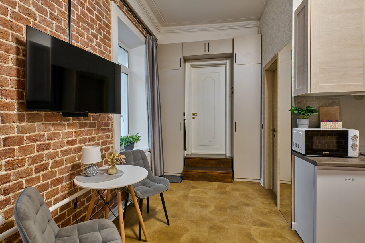 Здравствуйте, гостил в апартаментах 6-ть дней. Плюсы: приветливый и отзывчивый хозяин, удобное расположение, рядом от метро, куча кафешек и магазинов, работала ярмарка с домашними продуктами и свежими фруктами, в номере хороший ремонт, есть всё необходимое для длительного пребывания (можно и постираться и подладиться и приготовить ужин). Номер оформлен со вкусом. Минусы: окна выходят на проезжую часть, трамваи начинают ходить рано и если вы любите спать с открытыми окнами будет шумновато, но это решается простым закрытием окон, шумоизоляция потрясающая, конечно совсем шум не убирает, но очень сильно его уменьшает. Прям рекомендую! Если случиться бывать в нашей столице, обязательно остановлюсь здесь.