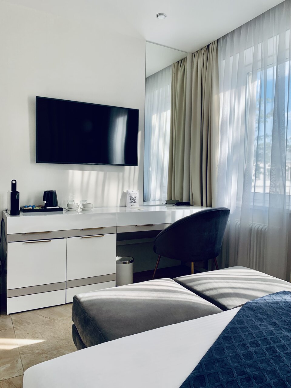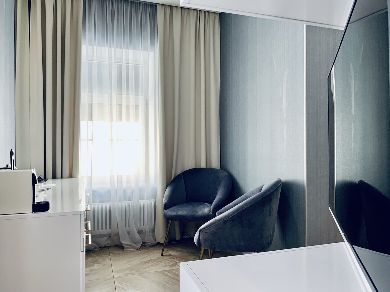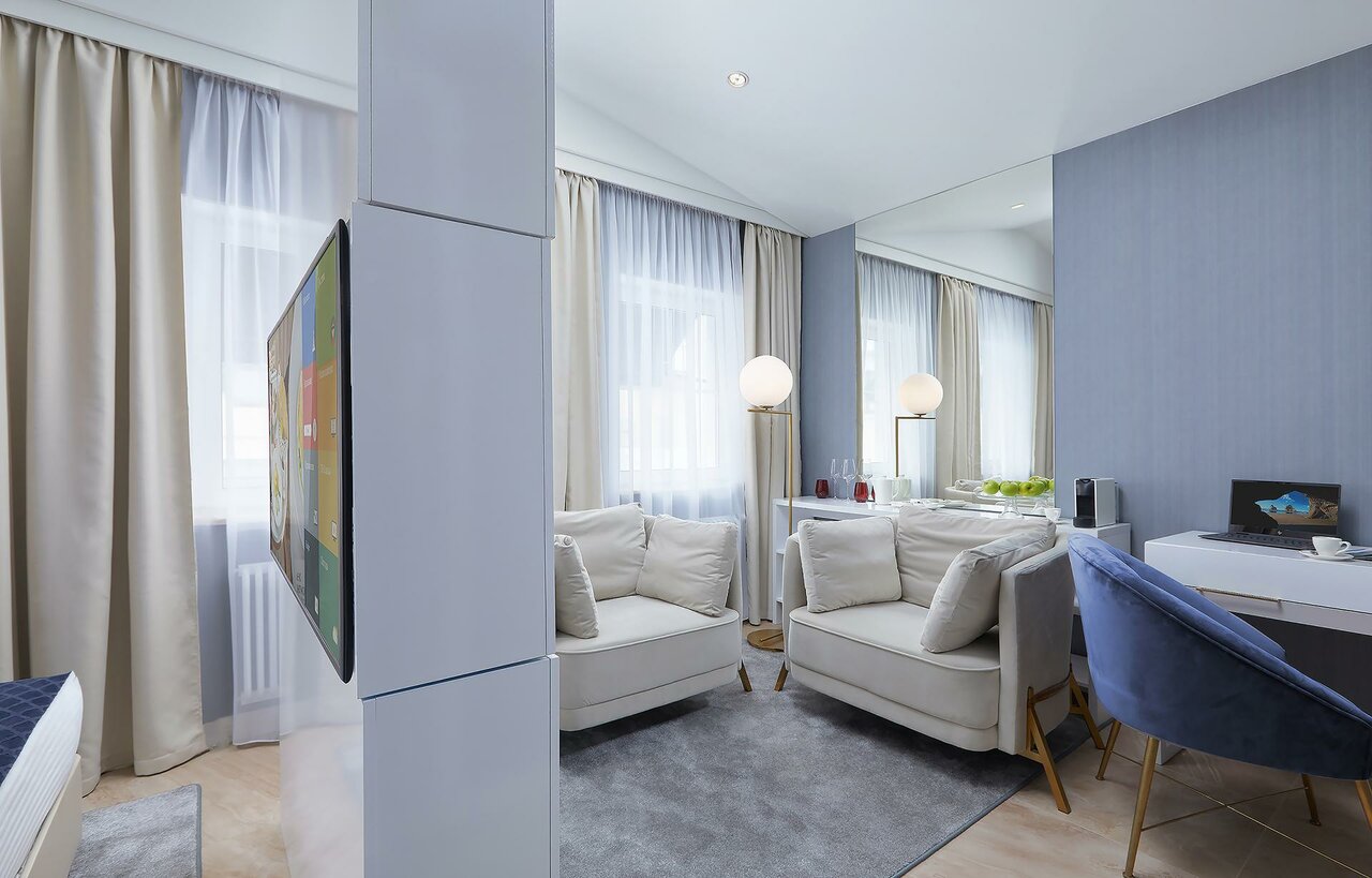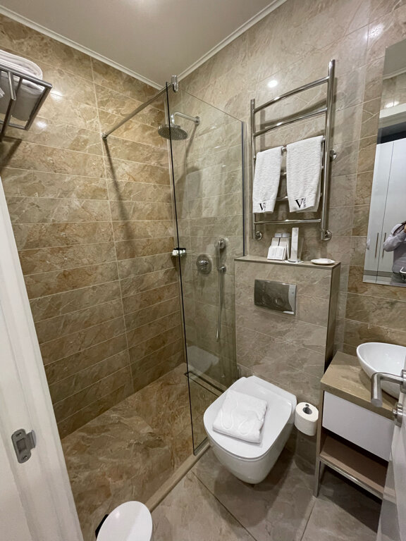 Прекрасный и комфортный улучшенный номер. В номере есть халаты, косметический набор и кофемашина. В стоимость входит парковочное место, прачечная и завтрак.