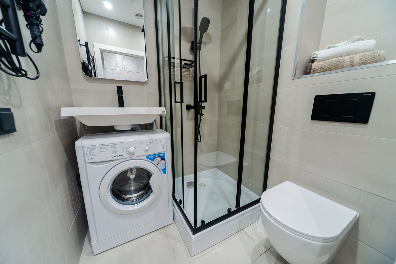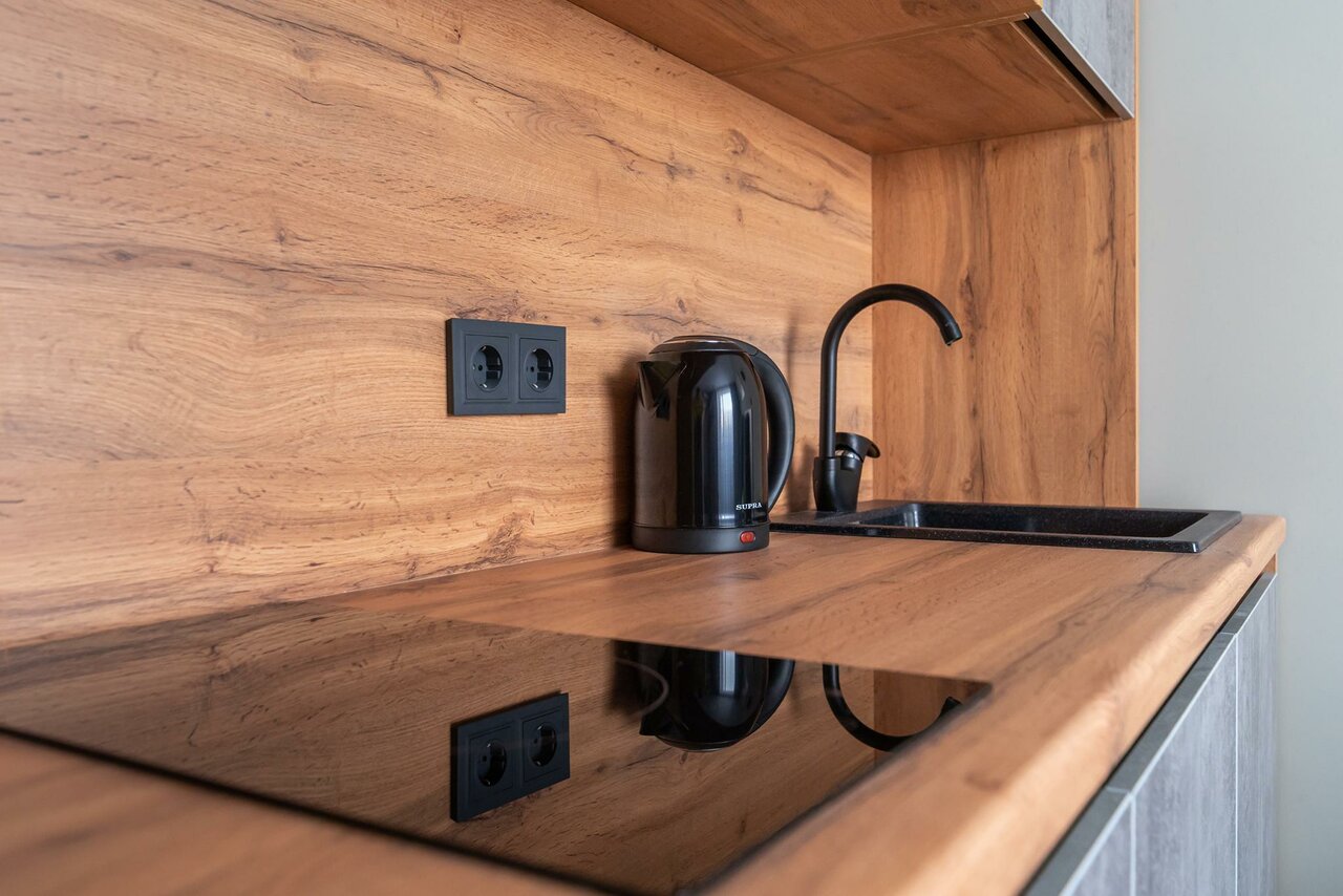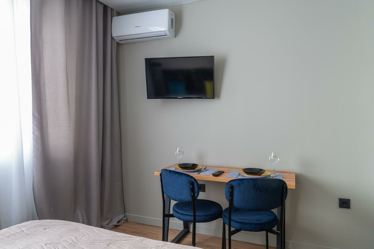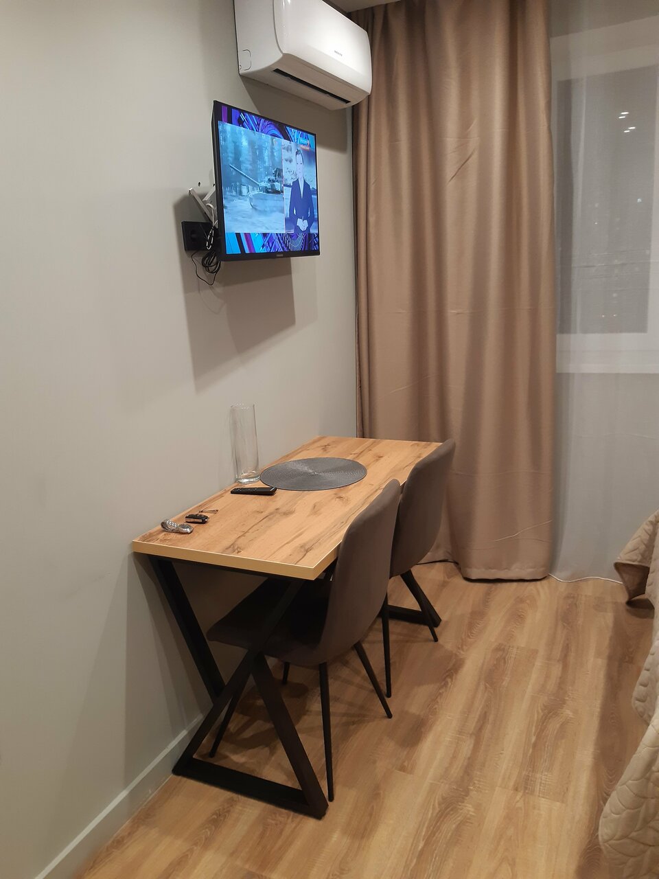 Отличный номер-квартира. Есть все необходимое: небольшая кухня, плита, микроволновая печь, набор посуды на 2х человек, включая кастрюлю, электрочайник и основные столовые приборы. В номере есть стиральная машина. Персонал обо всех изменениях, ремонтных работах и т.д. сообщает в Whats’ap.