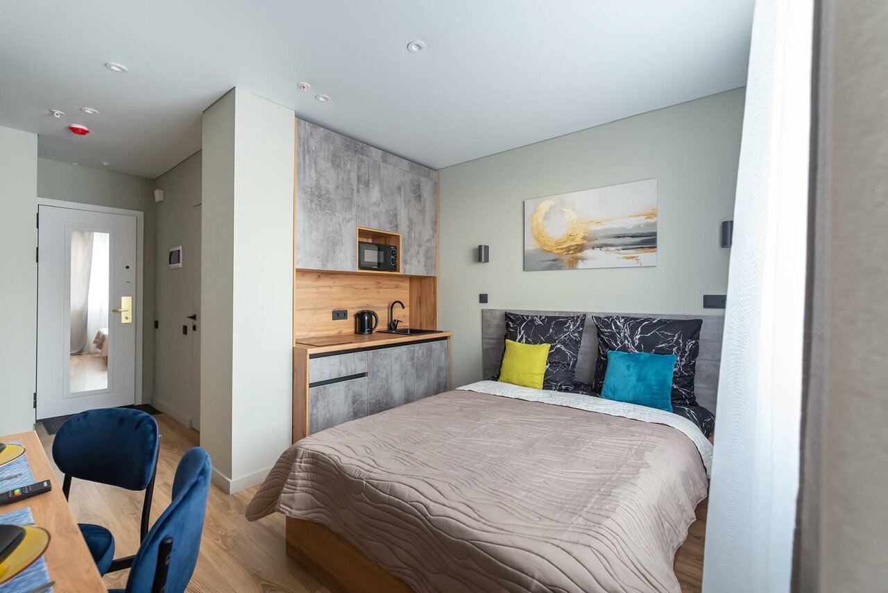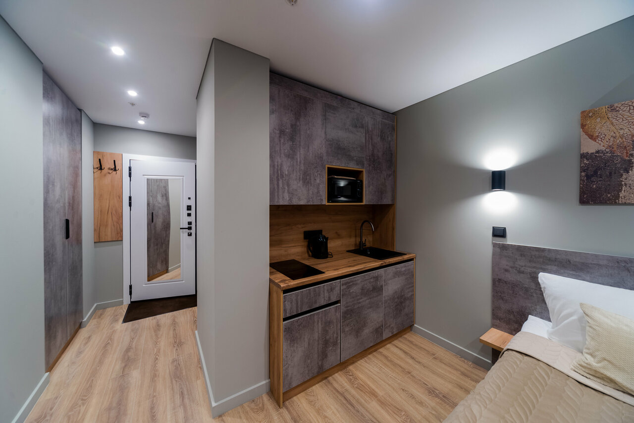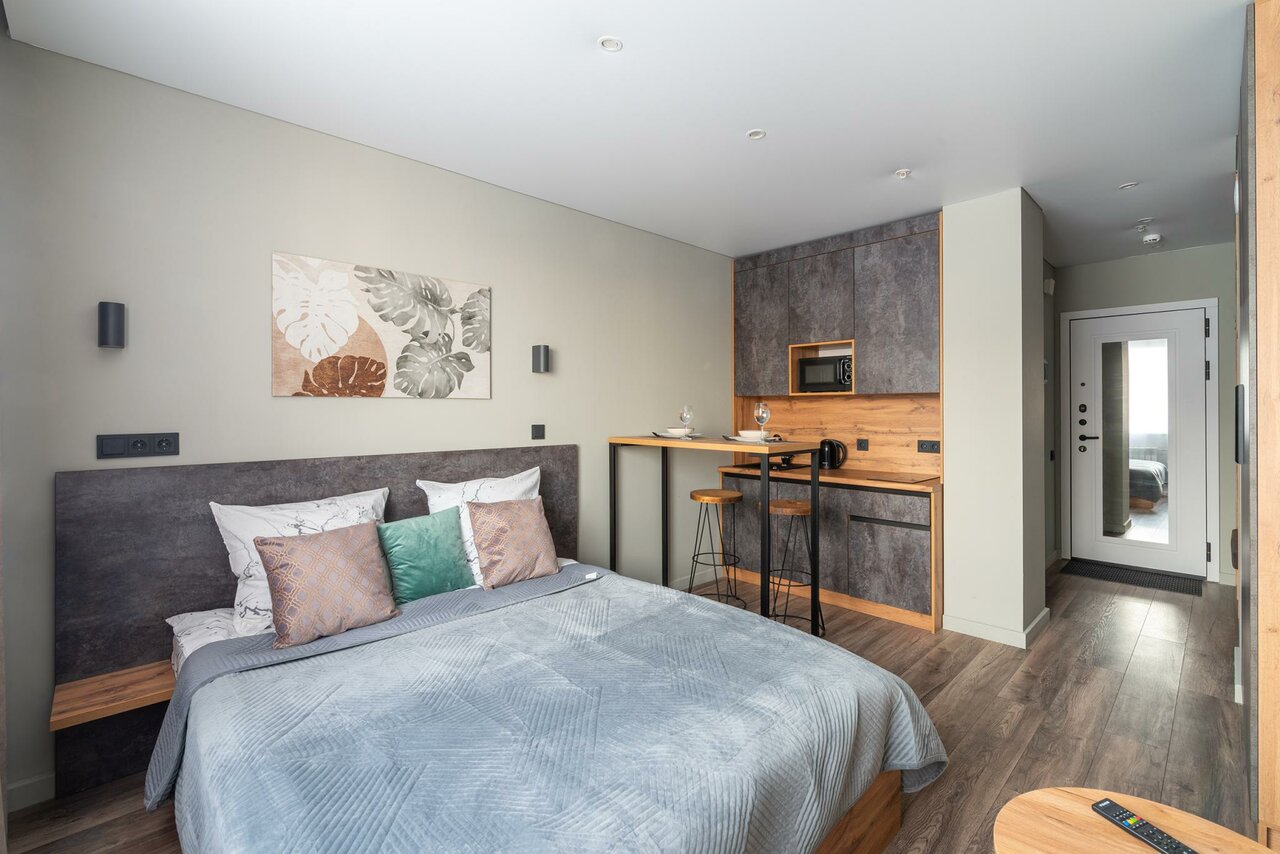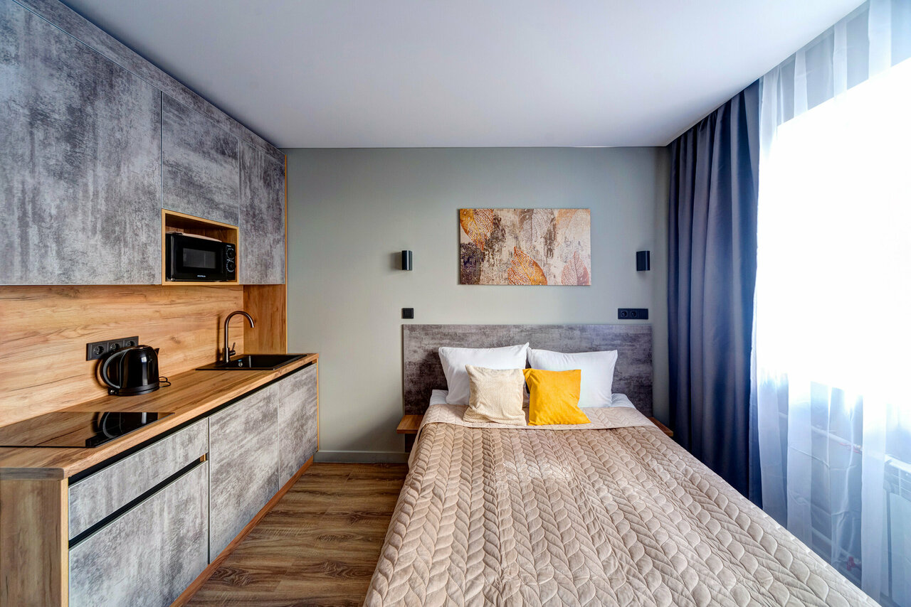 Номера категории Студия – это современные, комфортные номера, площадью 17 кв.м. с лаконичным дизайном. Лучший вариант для Гостей, которым важно соотношение цены и качества.