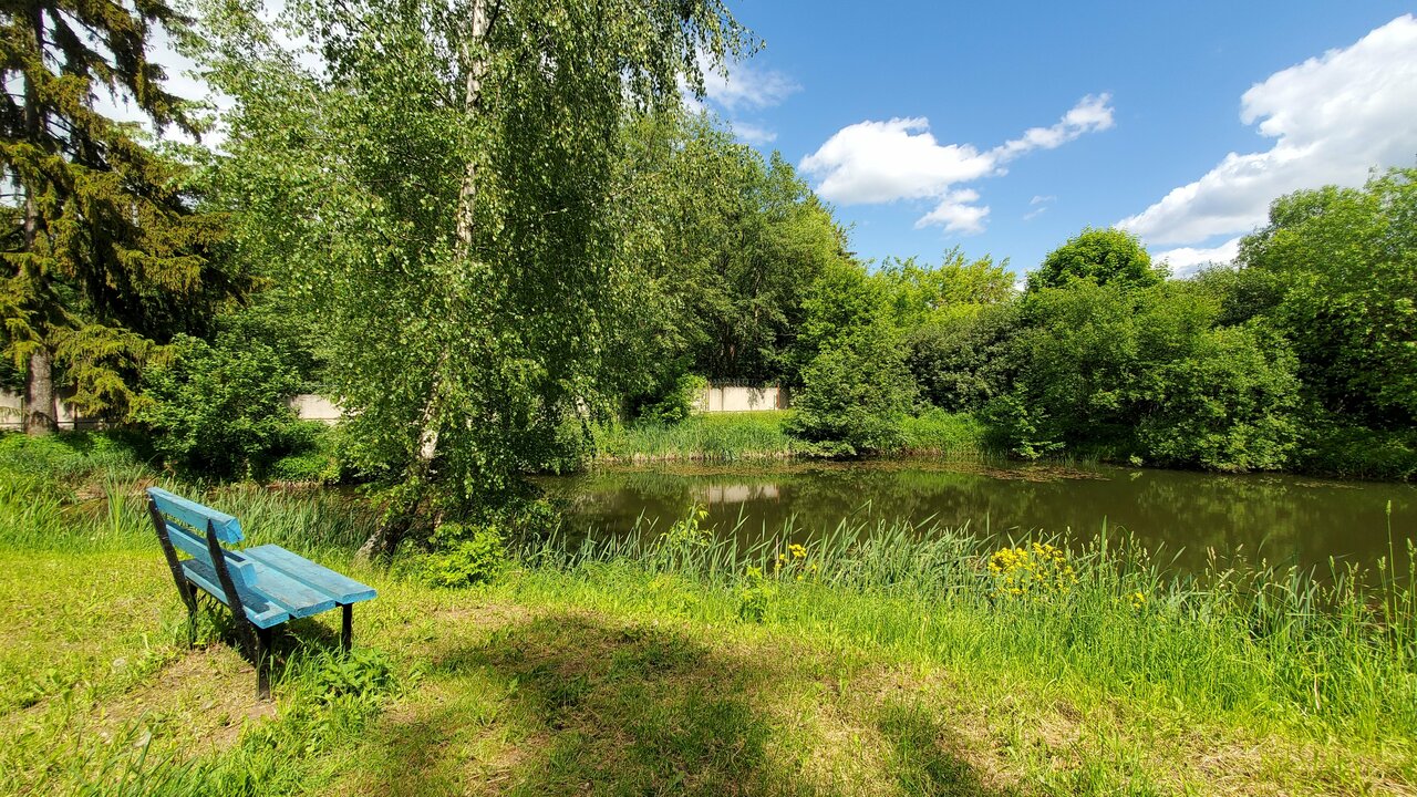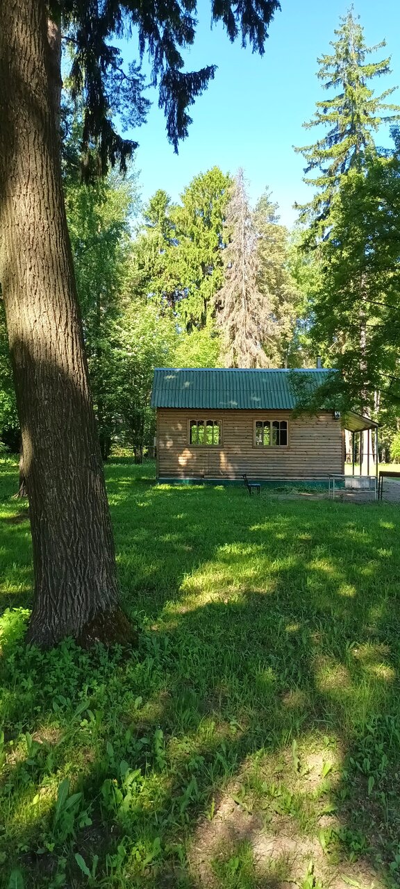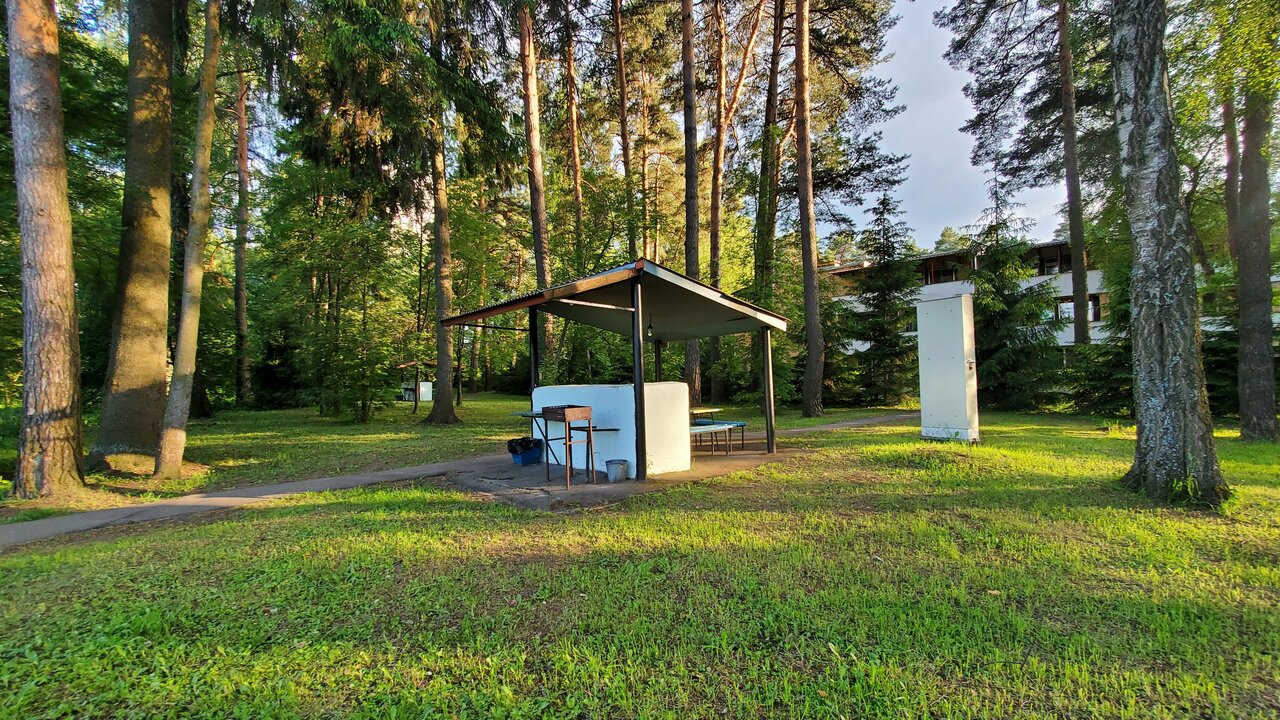 - Удобная парковка.; Тишина и уединение.; Удобное расположение в лесопарковой зоне.; Большая и красивая территория (сосны, пруд, беседки).; Наличие мангальных зон и бани.
