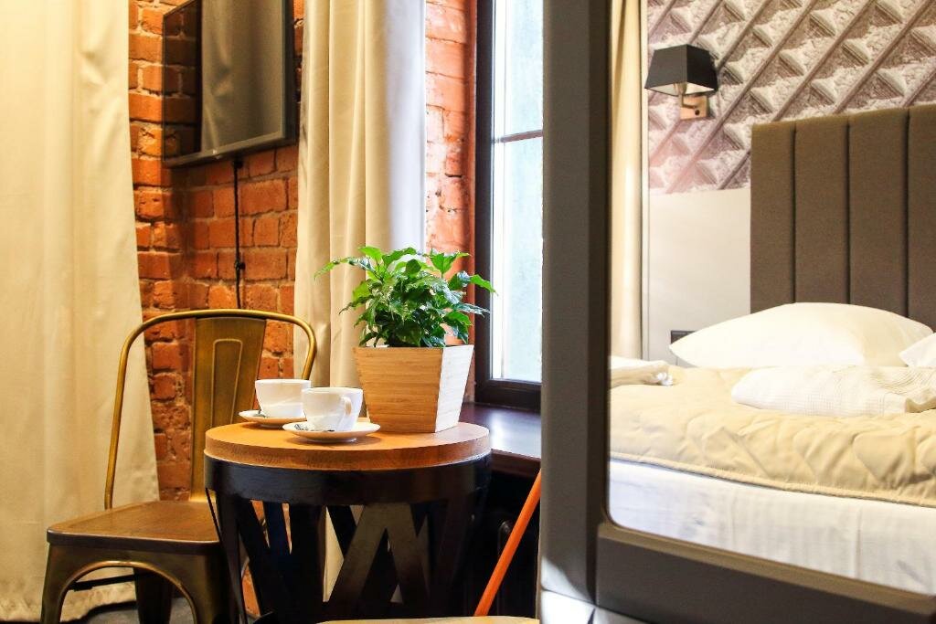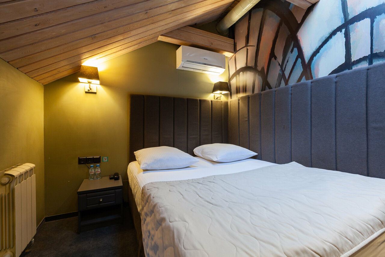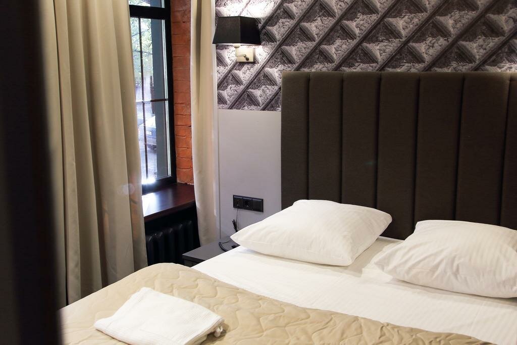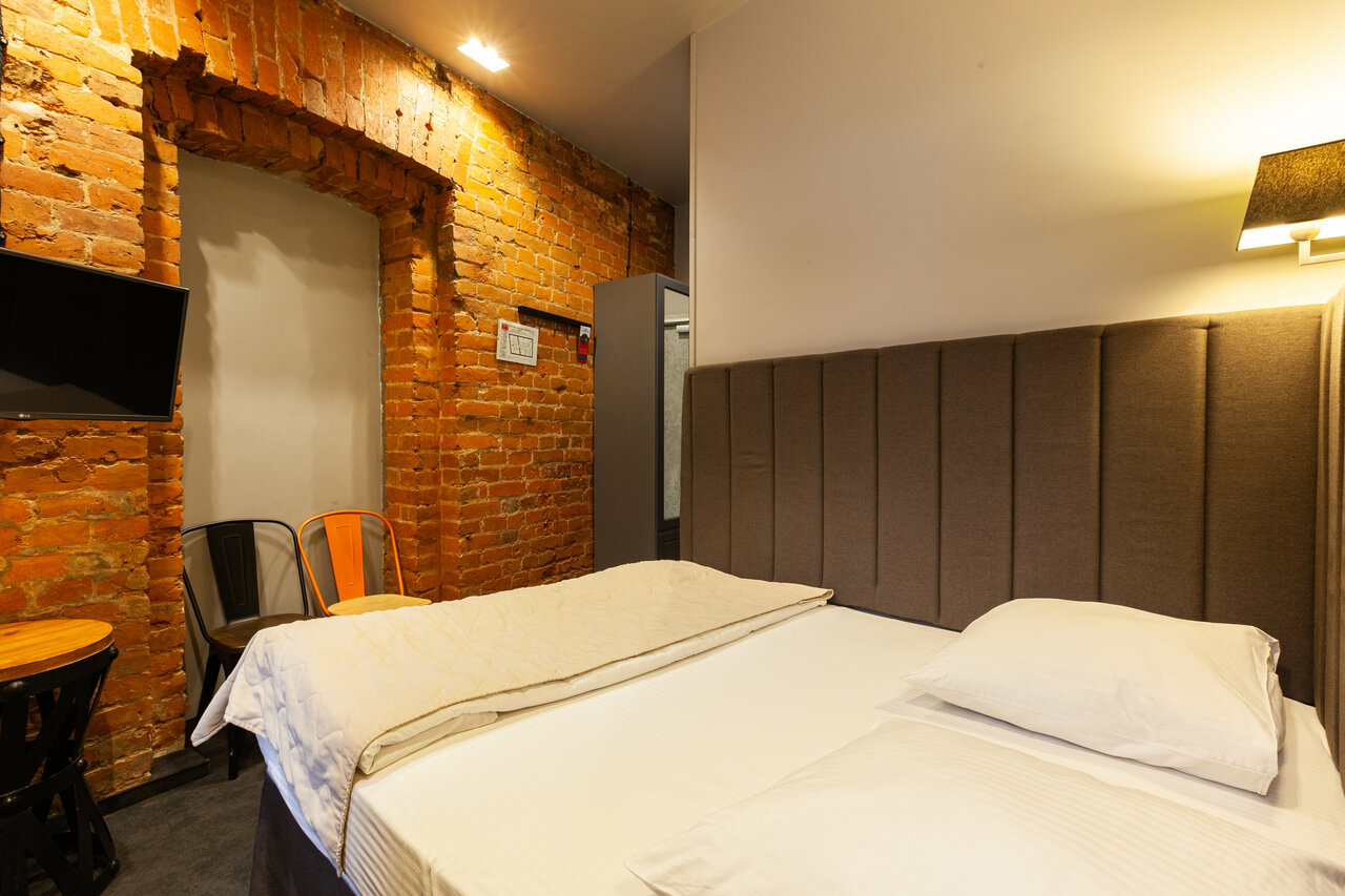 Маленький, но оснащенный всем необходимым номер: удобная кровать, стильная ванная комната с мыльно-рыльными принадлежностями, плотные шторы и телевизор. Выбирали по фотографиям — соответствуют действительности. Обязательно вернёмся)
