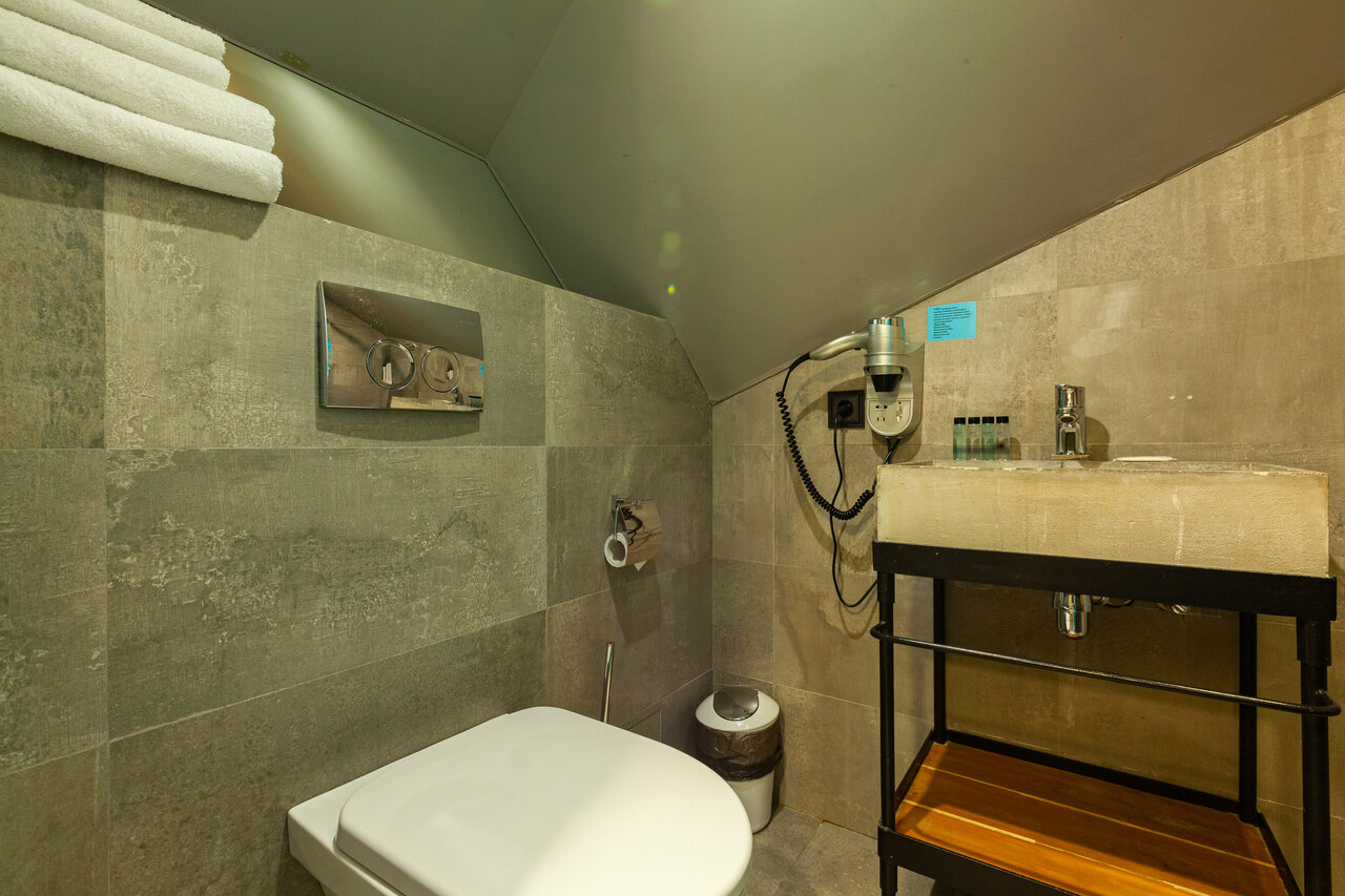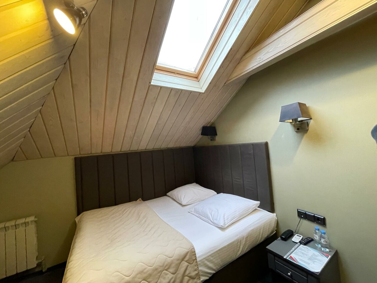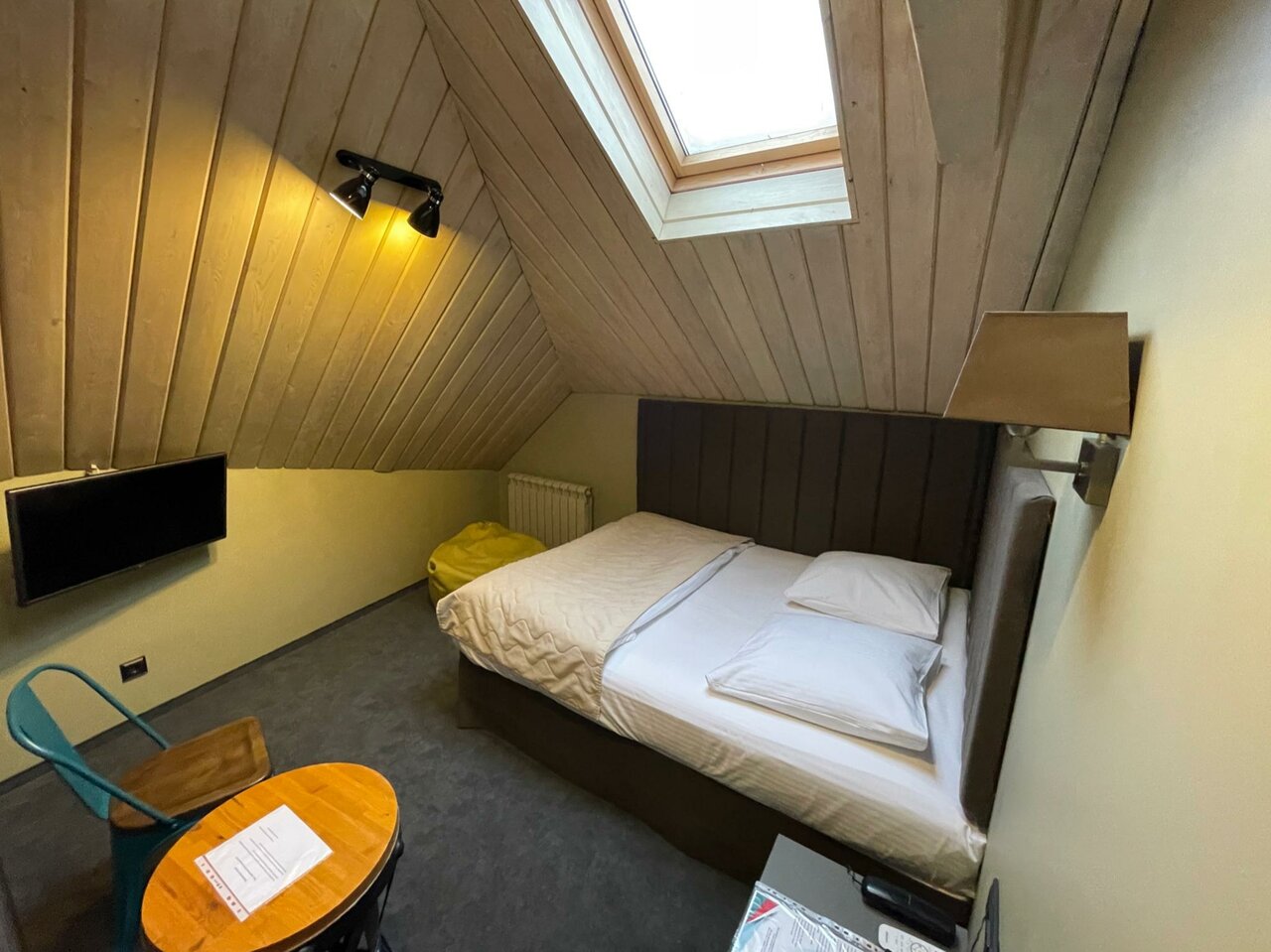 Маленький, но оснащенный всем необходимым номер: удобная кровать, стильная ванная комната с мыльно-рыльными принадлежностями, плотные шторы и телевизор. Выбирали по фотографиям — соответствуют действительности. Обязательно вернёмся)