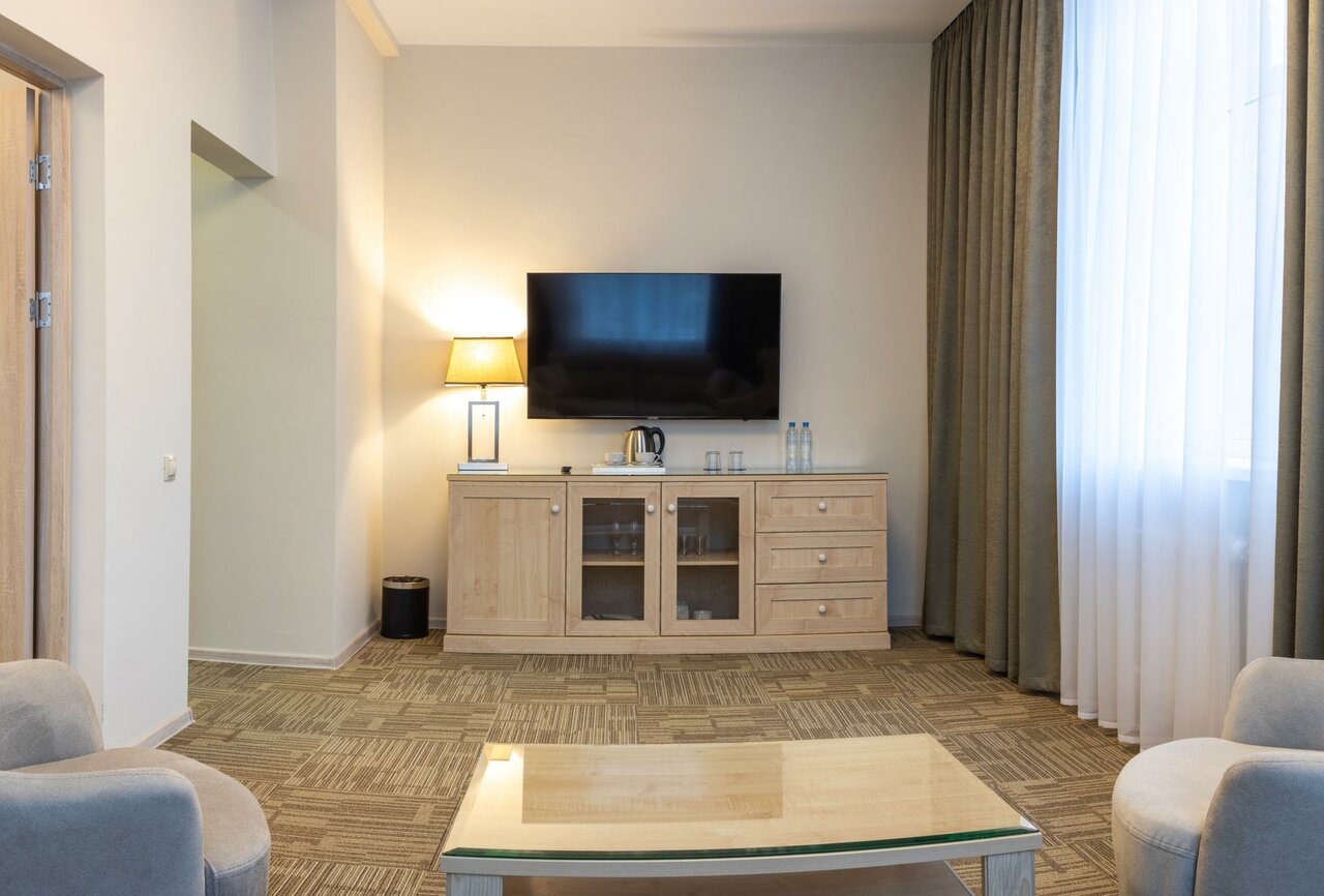 В номере 2 комнаты. В спальне: 1 двуспальная кровать 'Queen Size' 1,8х2,0 м, 2 прикроватные тумбы, туалетный столик, зеркало, телевизор 43', пуф. В гостиной: гарнитурная мягкая мебель, журнальный стол, сервант-греденция, телевизор 55', чайная стан...