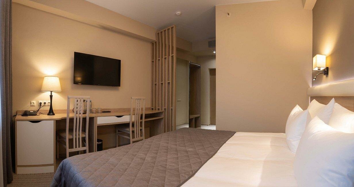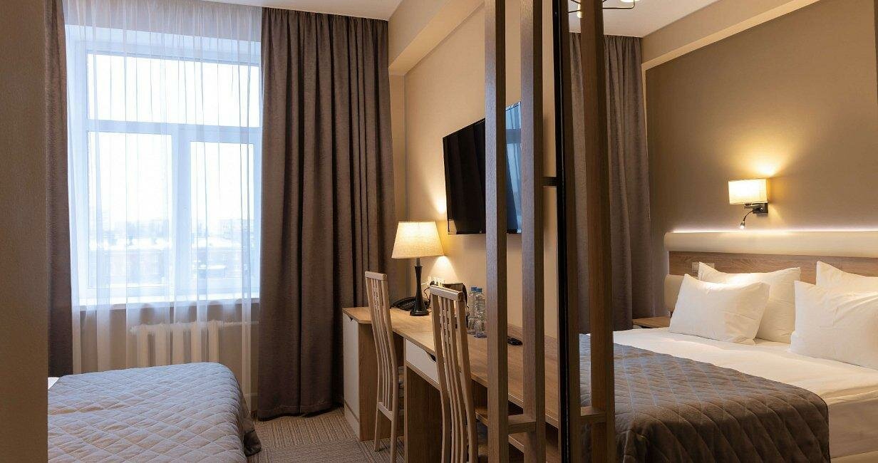 В номере: две кровати сомье встык (при необходимости есть возможность преобразовать в 2 раздельные кровати), 2 прикроватные тумбы, шкаф-купе, зеркало, стол рабочий, телевизор 43', холодильник, санузел с душевой кабиной, фен, сейф, косметические ср...