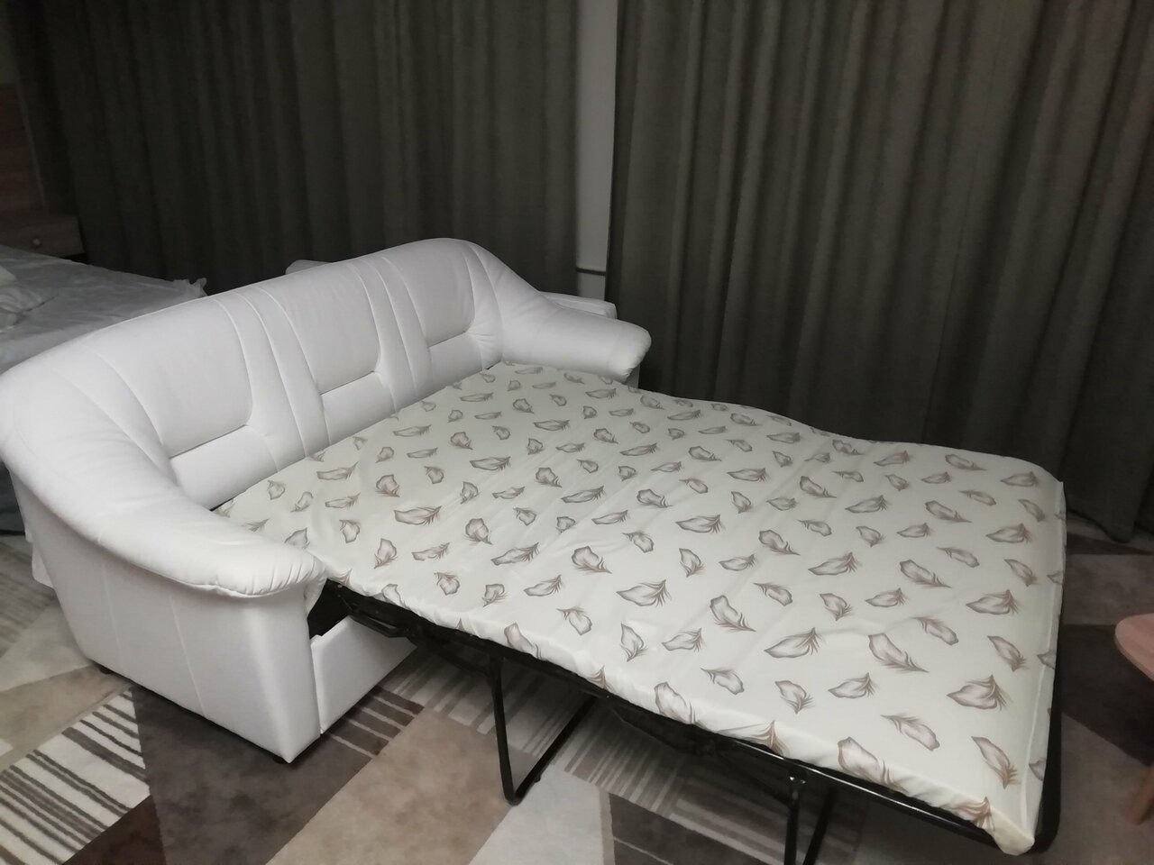 В номере: полутороспальная кровать 1,2х2,0 м, кресло-кровать, шкаф, стол рабочий, пуф, тв 32', холодильник, санузел с душевой кабиной, фен, косметика. Цена с завтраком шведский стол на одного, ребенок до пяти лет бесплатно. Кондиционера нет.
