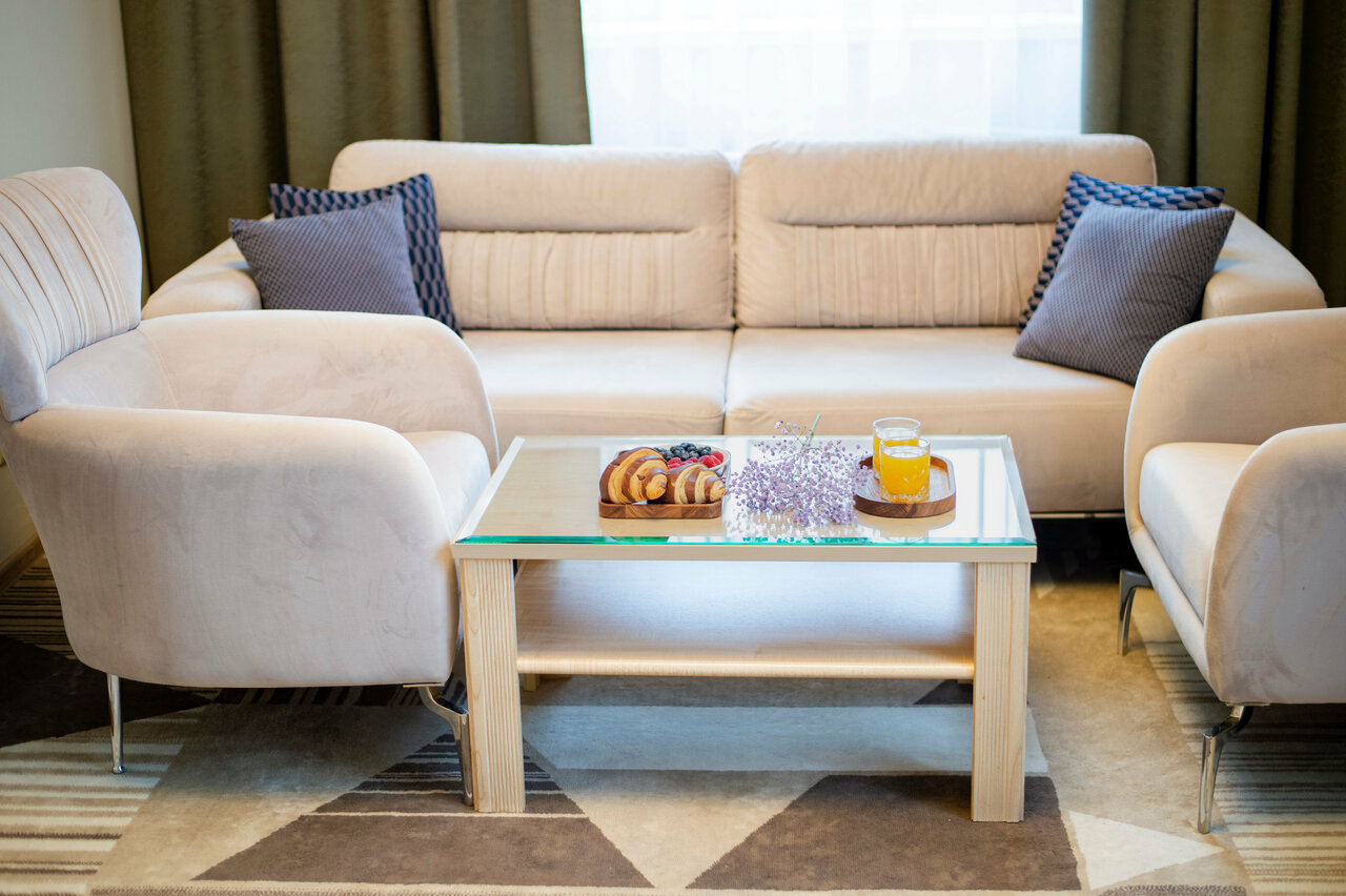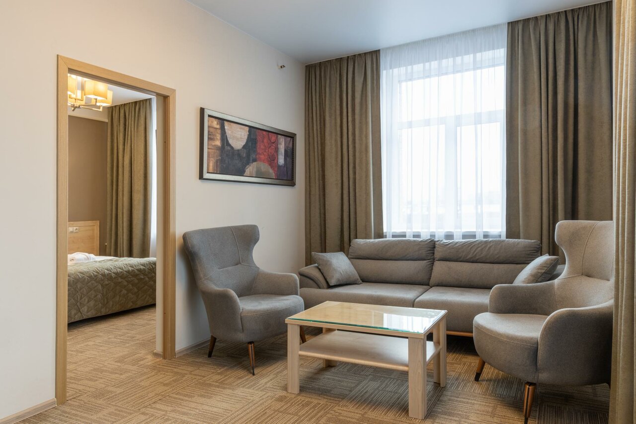 В номере 2 комнаты. В спальне: 2 односпальные кровати, туалетный столик, стул, зеркало, тумбочка прикроватная, кофейный столик и полукресло, телевизор 55'. В комнате-прихожей: кресло-кровать, шкаф-купе, сейф, барная стойка, 2 барных кресла.