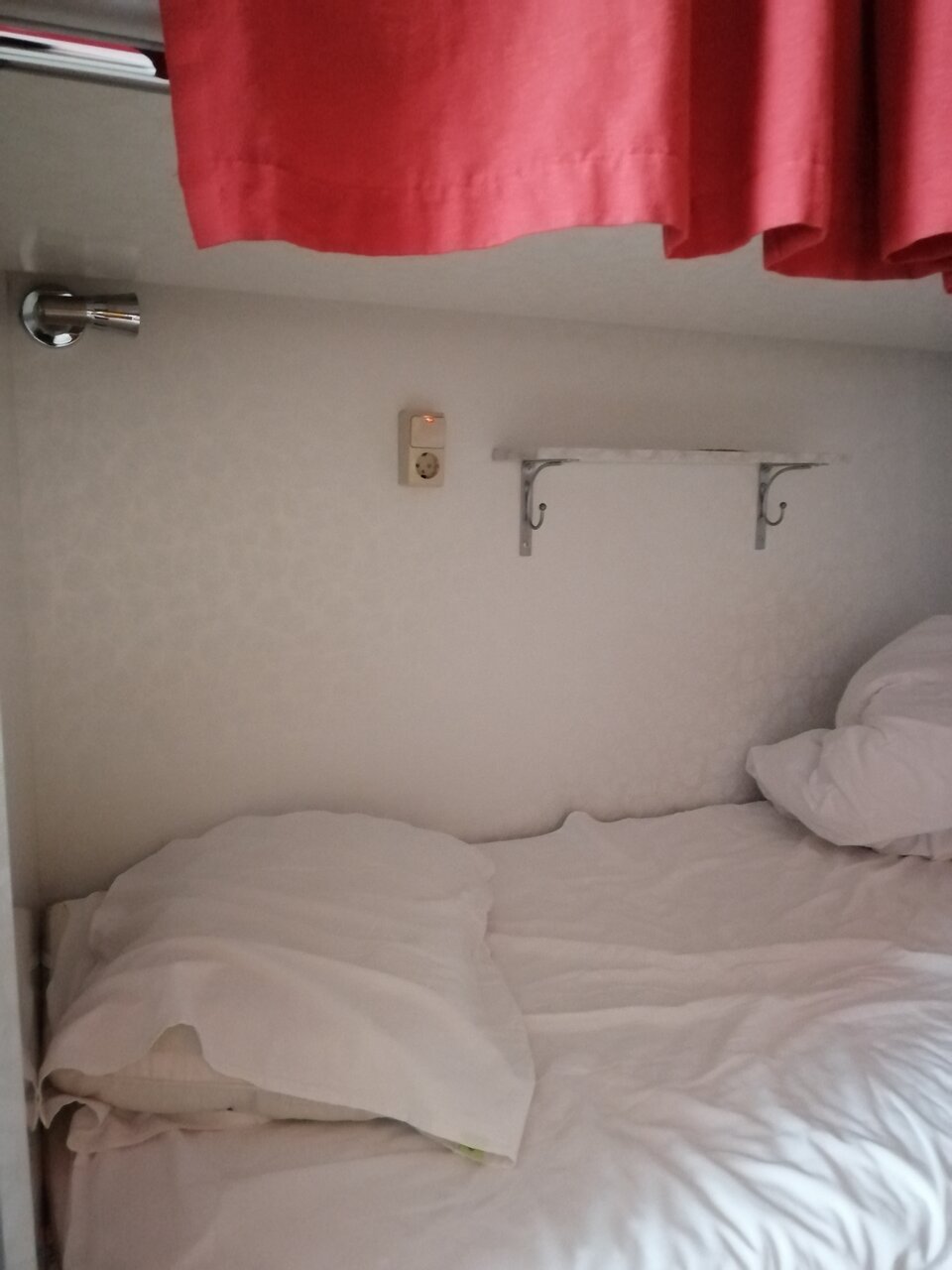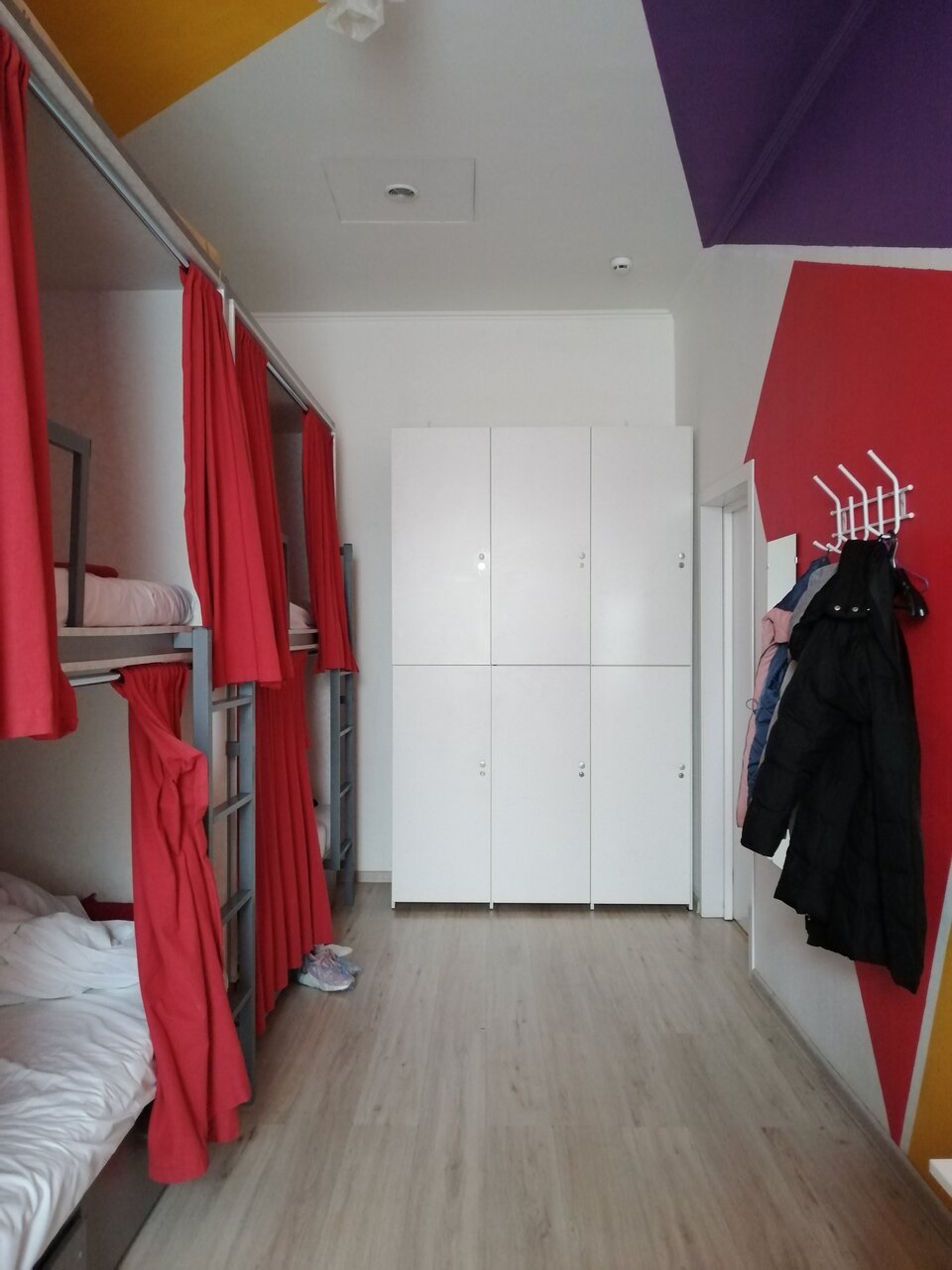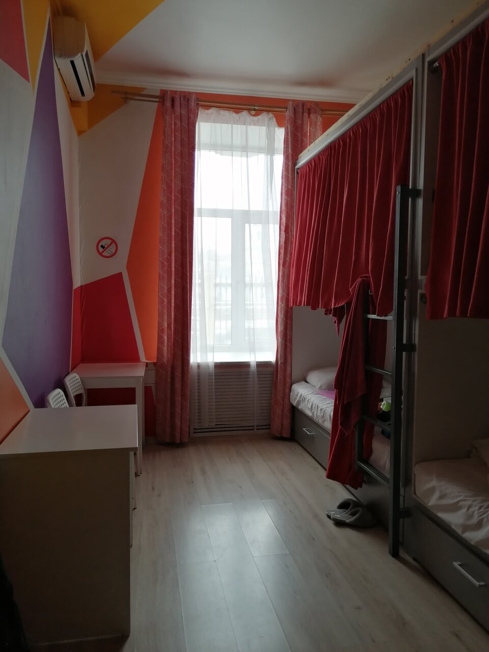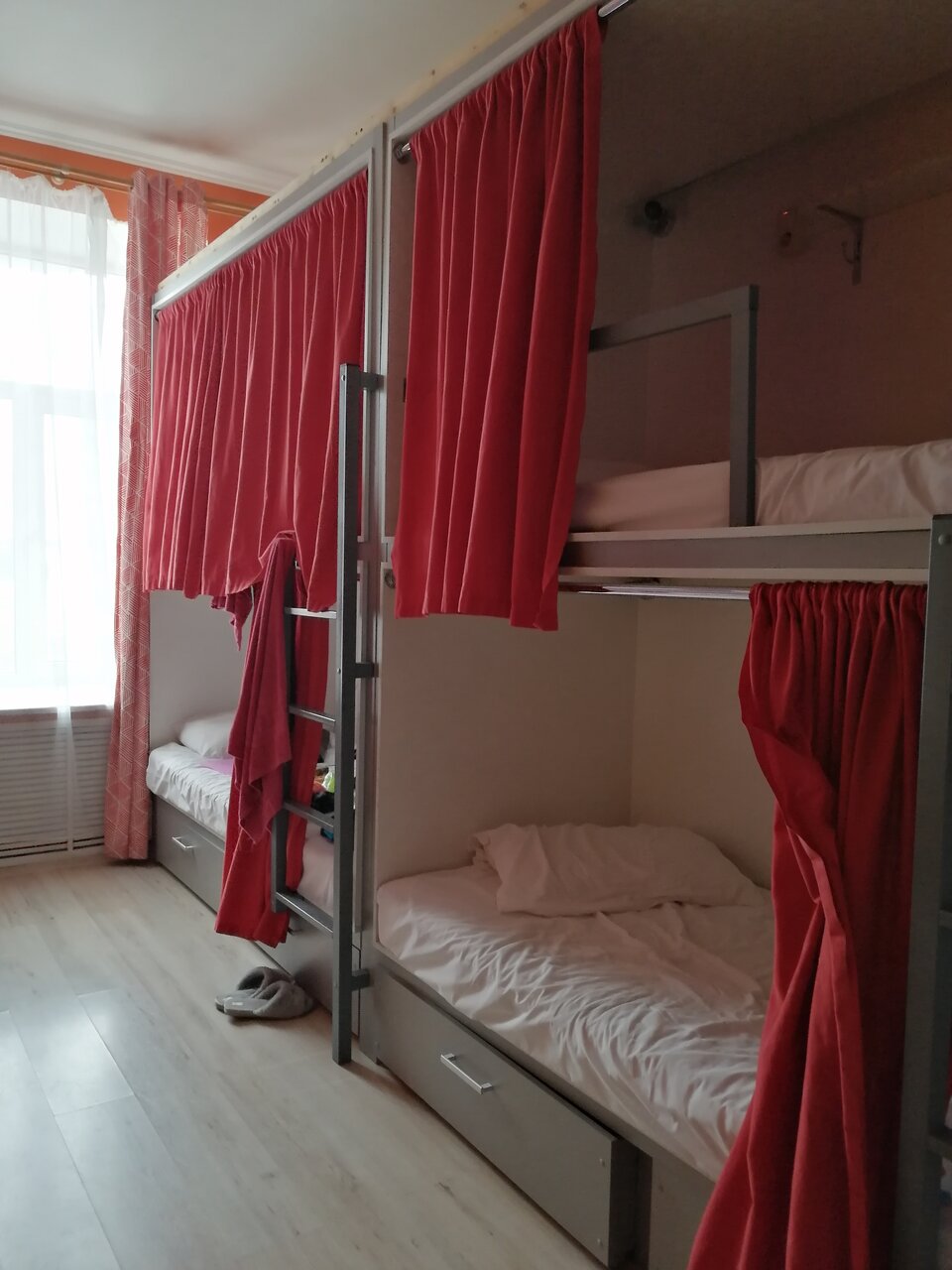 Очень удачное расположение хостела. Рядом парк Зарядье, Красная площадь- всё в пешей доступности. Брали номер на четверых, так как путешествовали вчетвером. Две двухярусные кровати, стол, стул, шкаф с четырьмя ячейками. Каждая кровать закрывается шторкой, у каждого есть свой светильник на стене и электрическая розетка. Ключ от номера нужно было оставлять на ресепшене. Вот там, кстати, редко присутствовал администратор. Приехали рано (в 7 утра) , хотели оставить вещи на хранение — никого на ресепшене нет, по телефону не дозвониться. На момент посещения работало две душевые кабины, три туалета на этаж. На кухне два холодильника, несколько столов. Ночью обнаружили аншлаг. Днём на кухне почти никого нет. Но мне показалось там несколько грязновато. В следующий раз взяла бы свою ложку с кружкой. Из бюджетного варианта где позавтракать- рядом с метро есть шоколадница с комбо завтраками.