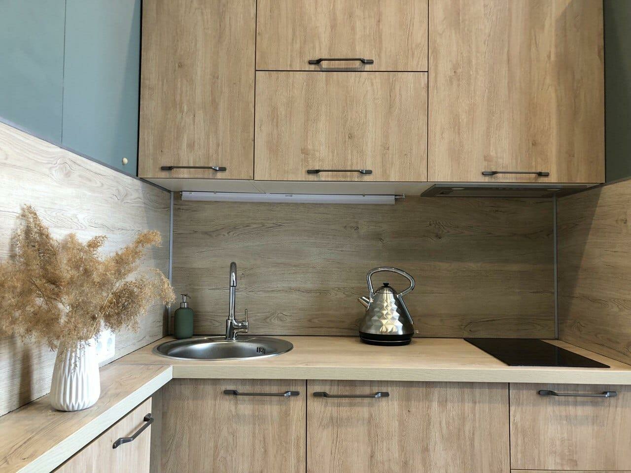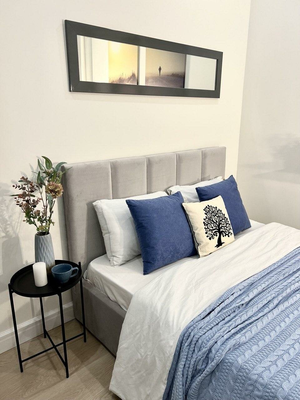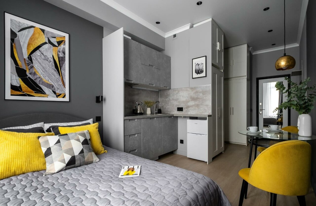 Номер Студио (20м2) оборудован большой двухспальной кроватью, собственной ванной комнатой, кухней.