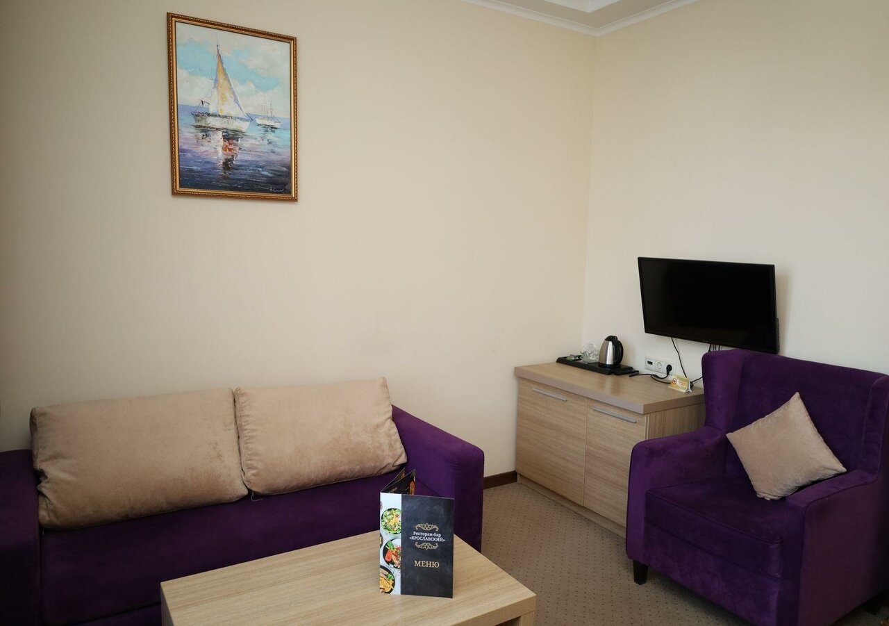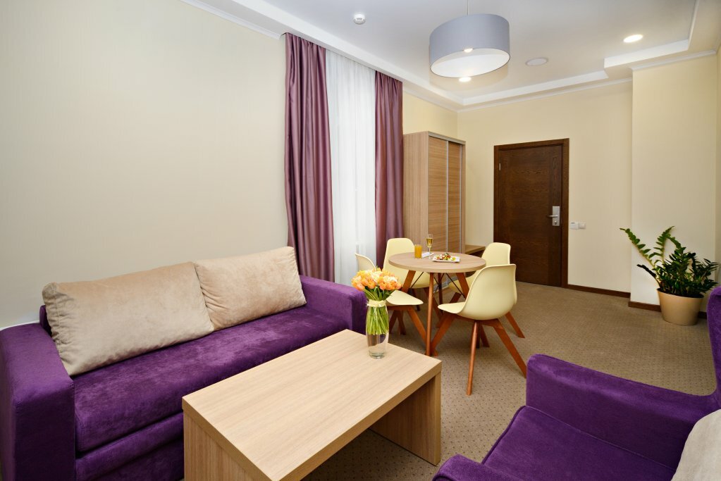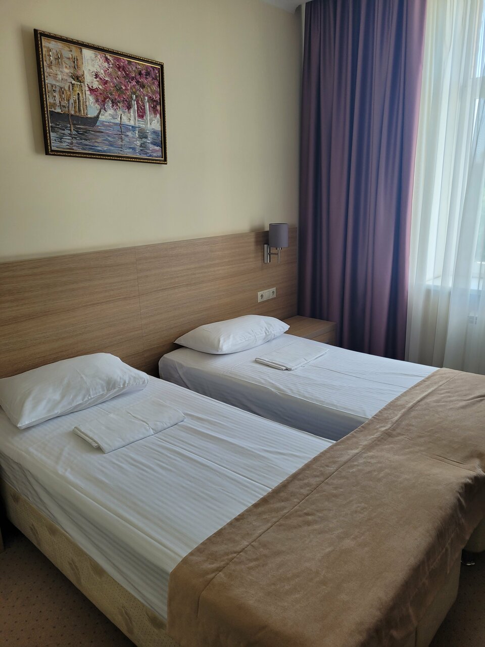 Расположение прекрасное. Еда- нормально, был включён завтрак, всё чисто. Однако номер был заказан на троих взрослых. Поместили в маленький двухместный и впихнули туда ещё кровать. Тумбочка- под столом, прохода совсем нет. Хорошо, только на одни сутки.