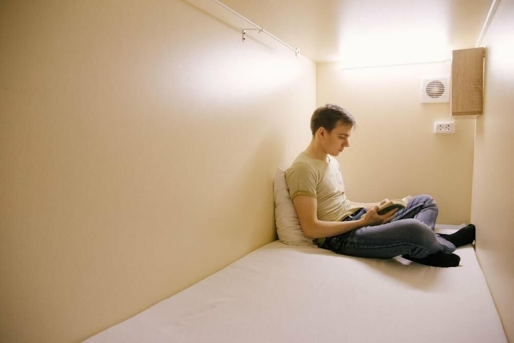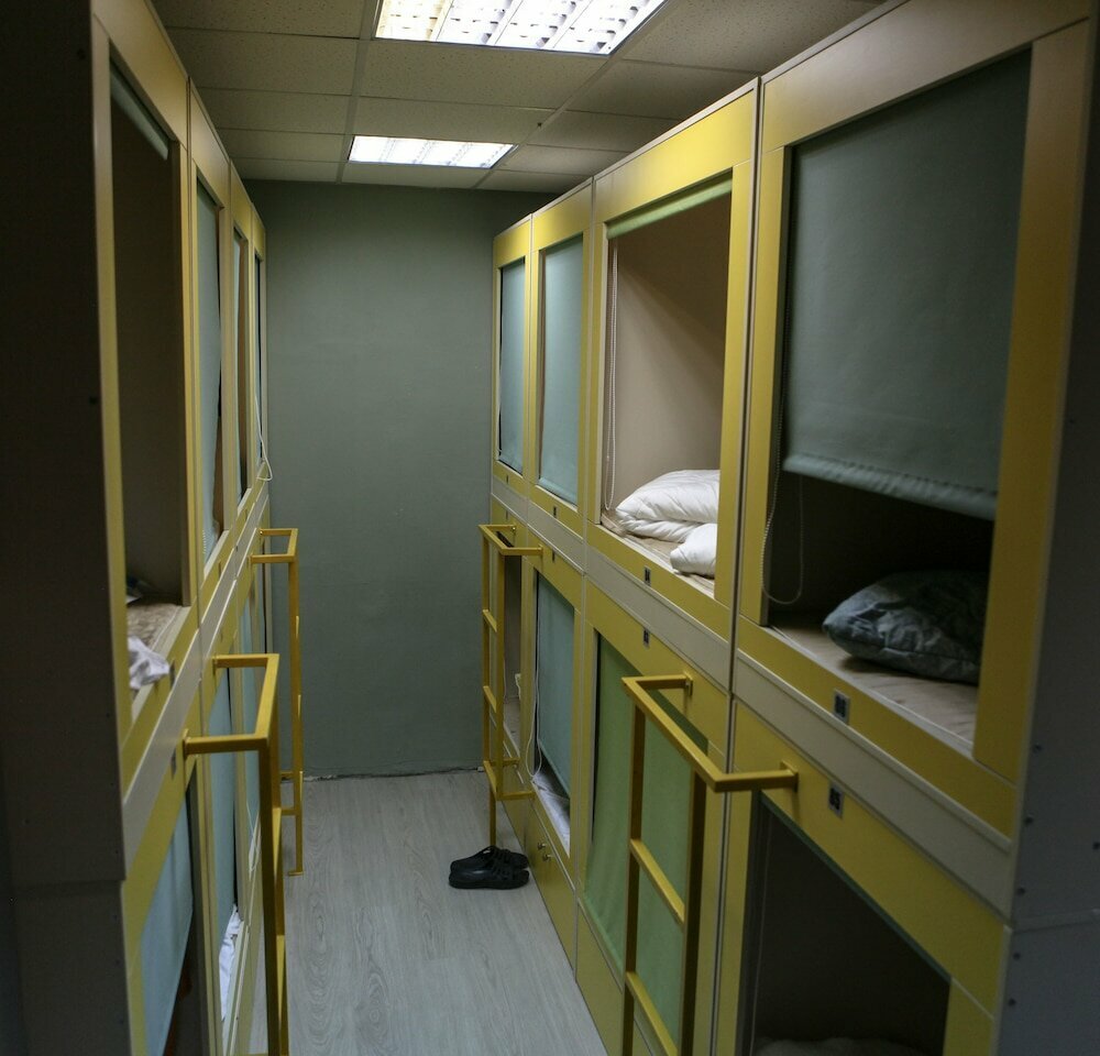 Отличный вариант для тех, кому хочется приватности за небол шие деньги. Забрался вкапсулу, закрыл шторку и всё — ты в домике)) В капсуле светильник, две двойных розетки, подушка/матрас/одеяло. На кухне несколько плит, раковин и холодильников. Выдают ключ от двери в хостел, можно приходить/уходить когда хочешь. Народу живёт немало, Но это оне чувствуется, т. У всех свой график. Отличная тран,спортная доступность — рядом метро, БКЛ и D3.