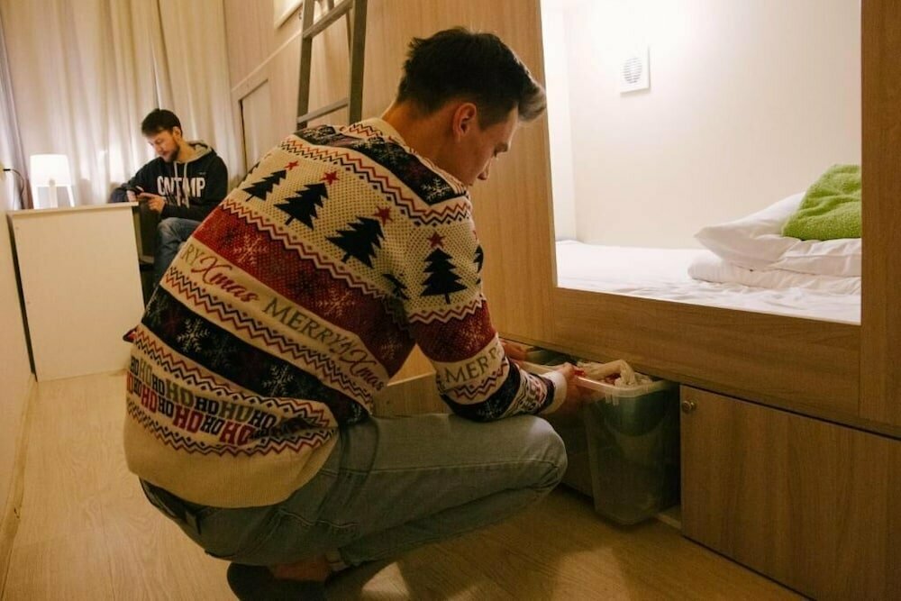 Я приездом из Красноярска. В Москве по делам впервые) Искал место где можно остановиться, читал отзывы и приглянулся этот хостел!) Взял номер за 550 наверху вчера, всё удобно, всё в новинку, эти капсулы, прикольные) есть личное место где можно побыть наедине, если хочется тишины и покоя, всё круто, кроме того как лезть наверх, сегодня взял за 600 внизу и радуюсь) Все жители довольно общительные и отзываются на любые вопросы, а также все молодые, что есть хорошо!) Сам я не очень общительный, но если останусь здесь надолго, то может заведу знакомства)) санузел раздельный, что тоже радует, кабинки удобные, ничего не мешает. Кухня хорошая, всё понятно и просто, круто что есть маркировка собственных продуктов. За такие деньги я бы здесь жил, уже подумываю найти работу и так и сдедать!) Радует что недалеко от метро, удобно!)) В общем не зря рекомендуют, 5 звёзд из 10 😀