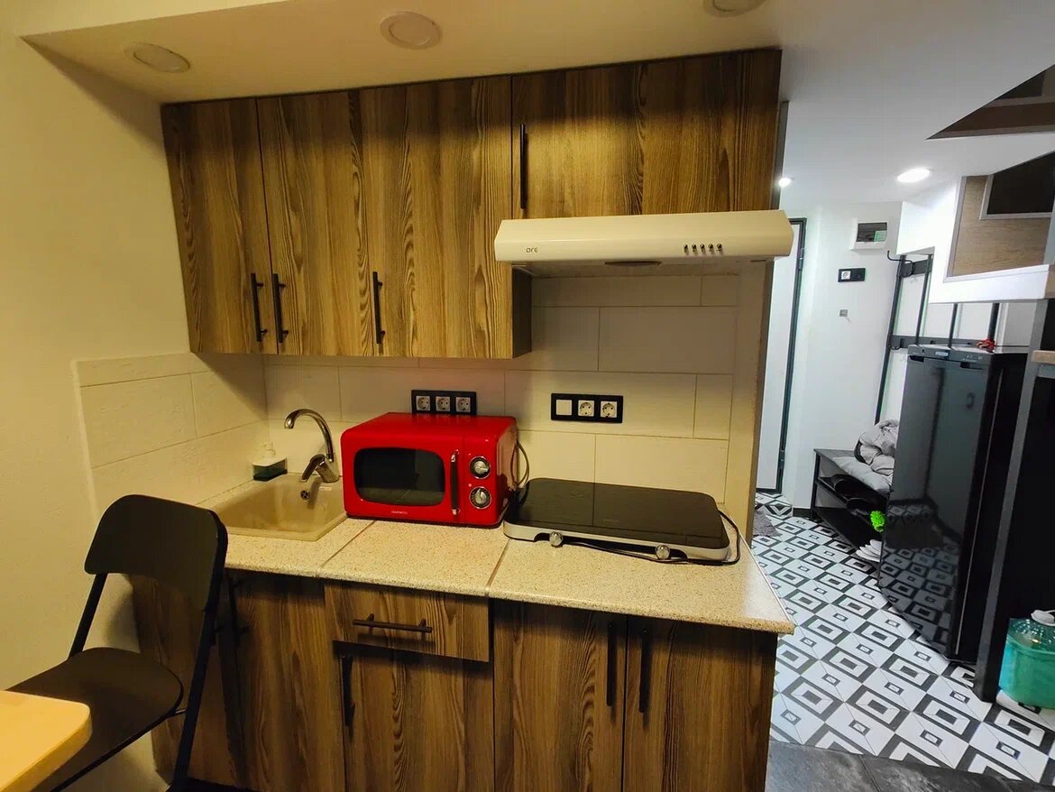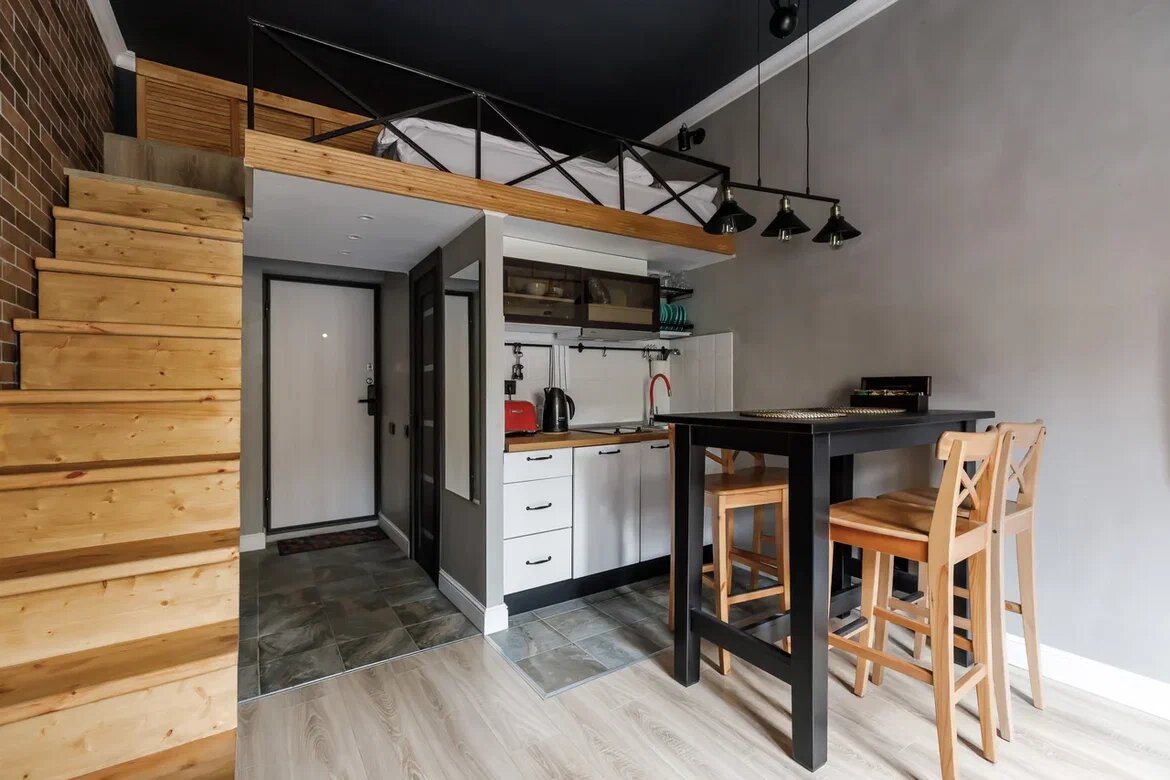 ‘+’ Удобное расположение. 2 супермаркета в доме. Напротив небольшой парк. В шаговой доступности есть все, что нужно. До метро близко. В номере все необходимое присутствует. Очень уютно, тепло. Спальное антресольное место — отдельный респект . Тв и интернет работают без нареканий. Приятный теплый свет. Окна выходят в тихий двор. Нам все очень понравилось, приедем к вам снова! ’-‘ Диван сломан. Шкафчики в ванной и в кухонном уголке изрядно изношены и требуют замены. Подушки тоже неплохо было бы обновить. Пыль на книгах, на подоконнике. Брызги чая на стене.