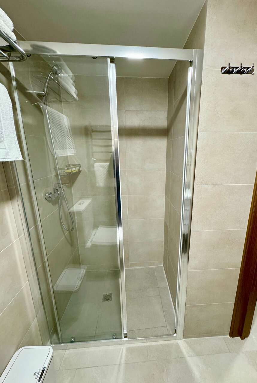 Достаточно интересные номера. В номере есть зубные щетки, шампунь и мыло разовые, чайник, чай, сахар в номере, тапочки, утюг на этаже. Машину без прицепа можно поставить нормально. У нас в номере оказался мусор в урне. Вход в номер по карточки. В нашем номере окна не было и было очень душно. Кондиционер работал на 16 градусов, холодный воздух не шёл. Подогрев пола отключить не получилось, не нашли пульт, а тот, что в коридоре был отключен. Вода в душе работает с переменной температурой, как контрастный душ. В целом в номере достаточно просторно, приятно, свет хороший.