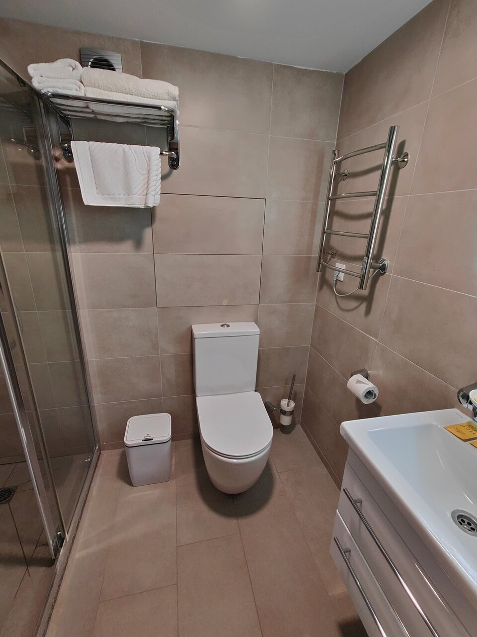 Очень уютный номер: есть все необходимое, кухня с посудой, санузел + душ с полотенцами и необходимыми косметическими принадлежностями. Очень понравилось, что номер двухуровневый. До метро по прямой дороге недалеко. Еще бы магазин в шаговой доступности, было бы просто великолепно. Но на этот случай есть ресторан в отеле или можно заказать привычную доставку.