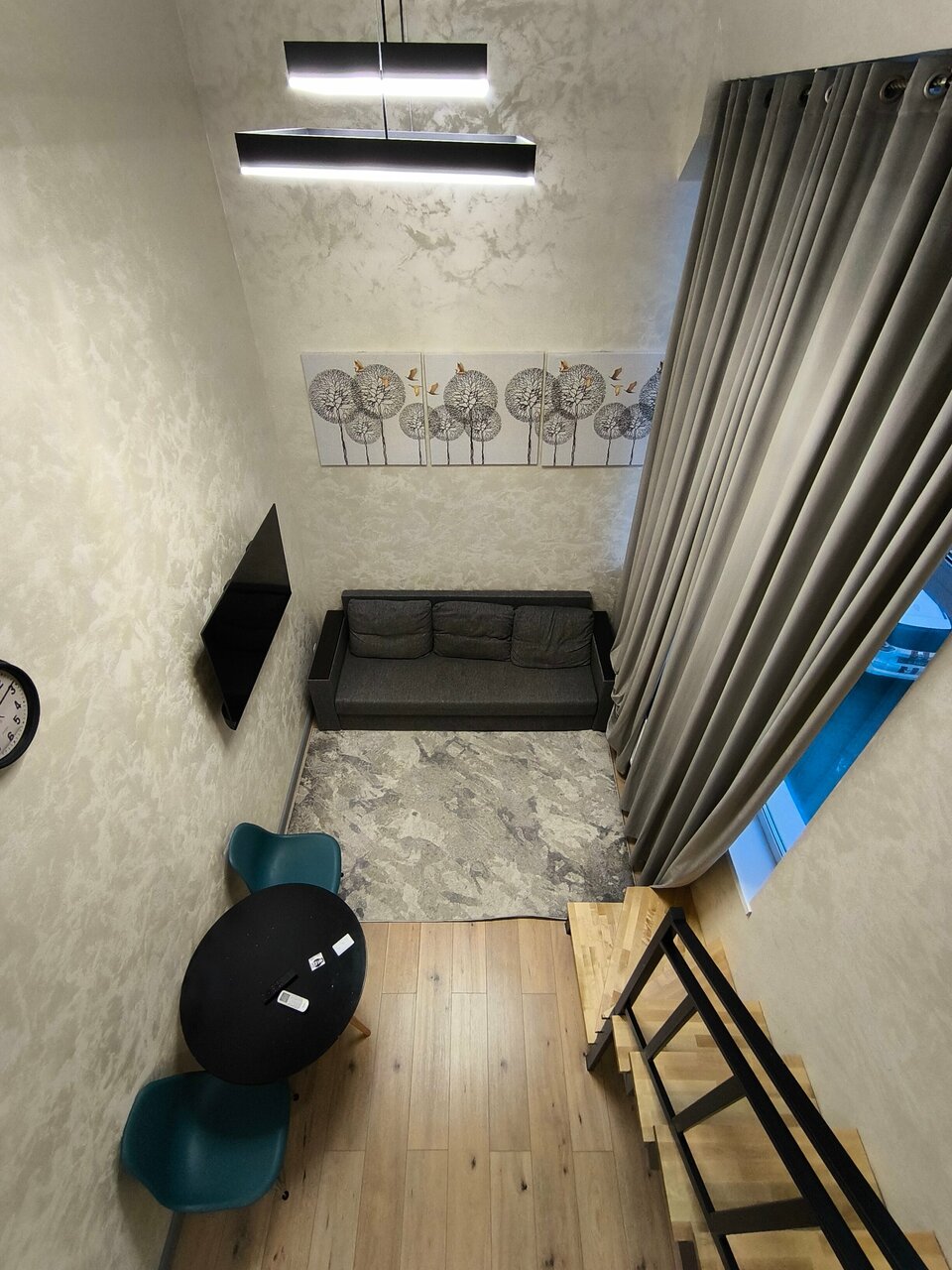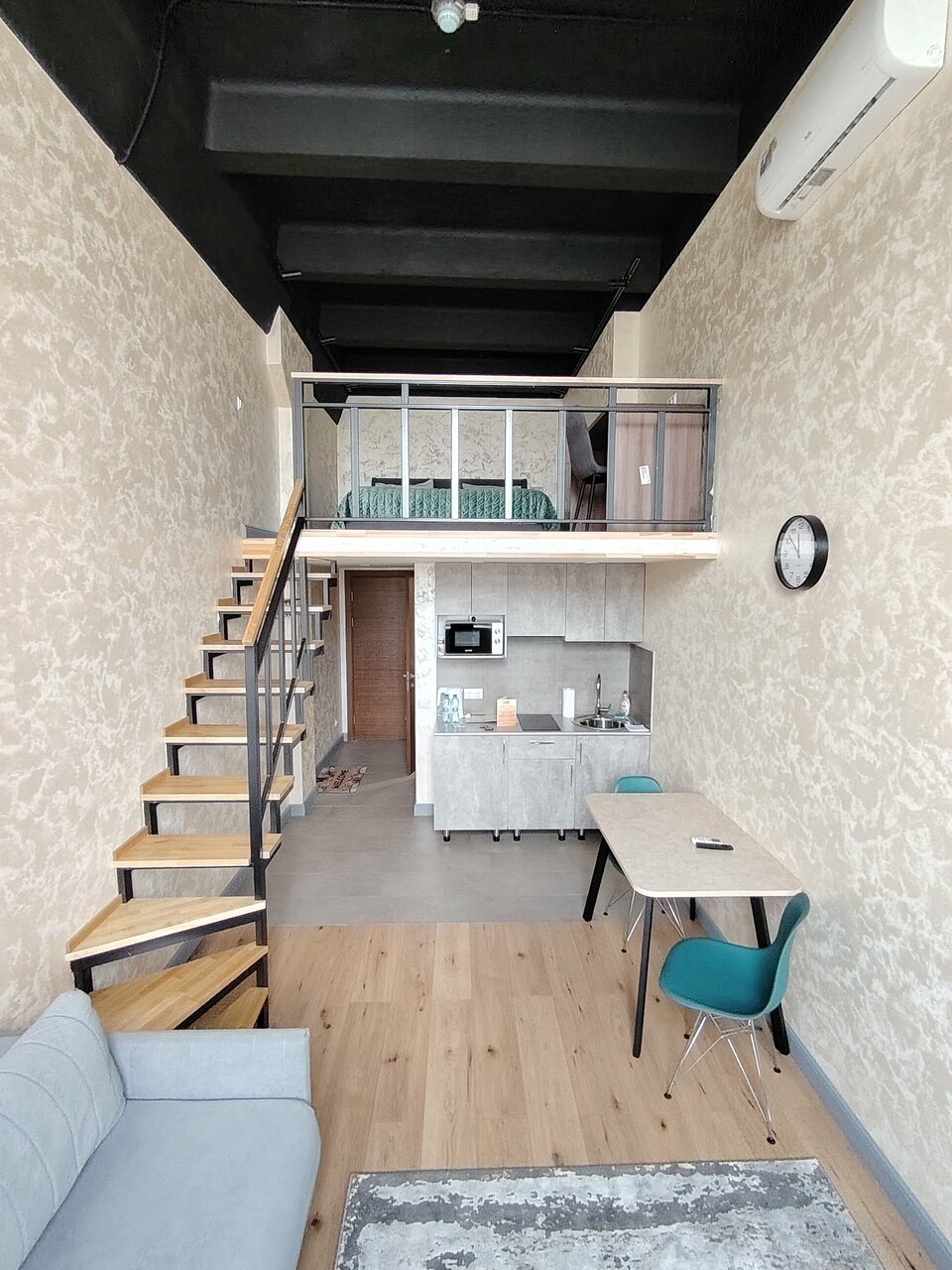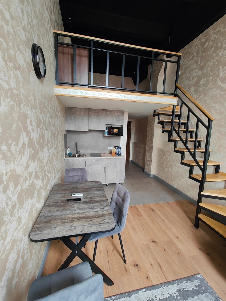 Двухуровневые апартаменты, где вы получаете высокое качество, комфорт и сервис.В наших номерах два этажа, каждый со своими особенностями.На первом этаже гостиная, мини-кухня, ванная комната.На втором этаже находятся спальня и рабочая зона.