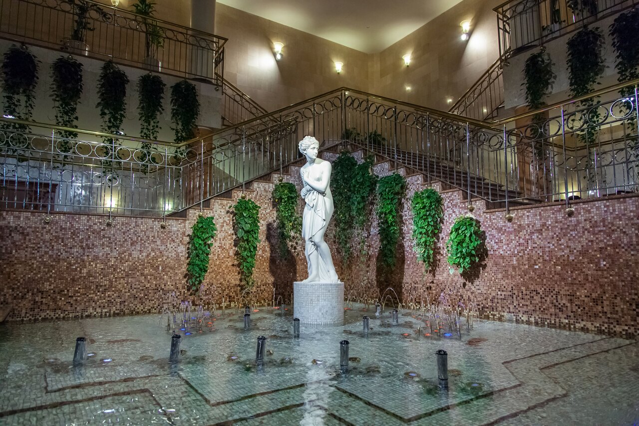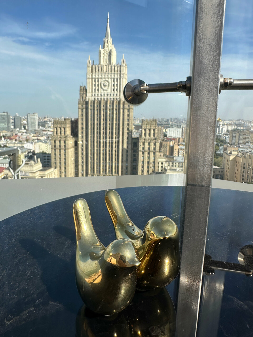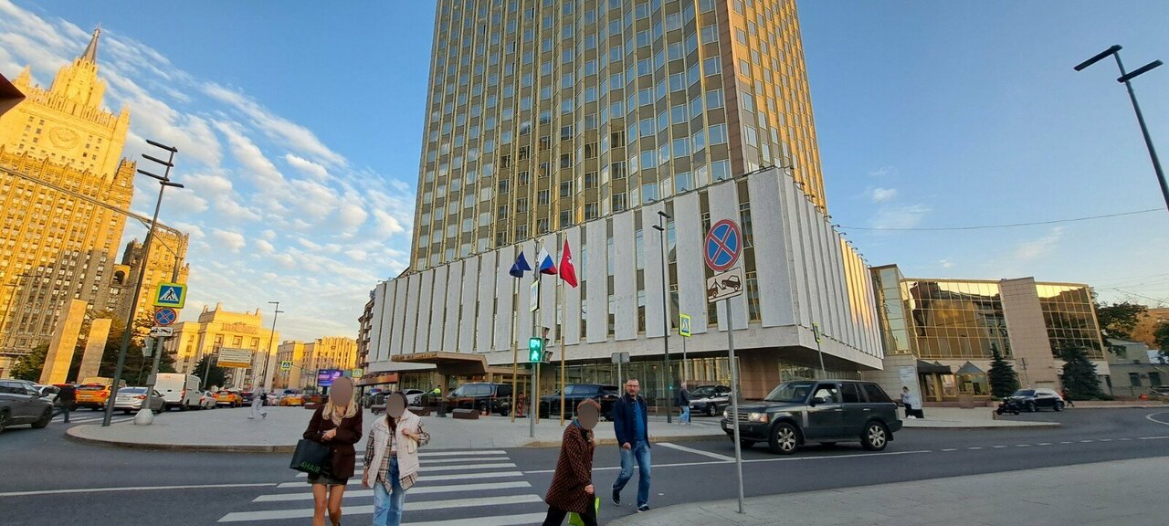 Не могу судить о номерах, была здесь на лекции, поэтому смогу оценить места общего пользования. Звёздочку сниму за отсутствие лоска. Гостиница с 5 в центре города, рядом с Арбатом и напротив МИДа в моём представлении, должна быть образцовой, с образцовыми туалетами, машинкой для чистки обуви, желательно несколькими. Холл просторный, посредине статуя в искусственных подсолнухах. К сожалению, на память на фоне статуи сфоткаться не удастся-обе лестницы наверх (как оказалось, к главному ресторану), перекрыты. К работе гардеробщиков и швейцаров претензий нет, всё отлично. Персонал улыбчивый и приветливый. Вот, впрочем, и всё