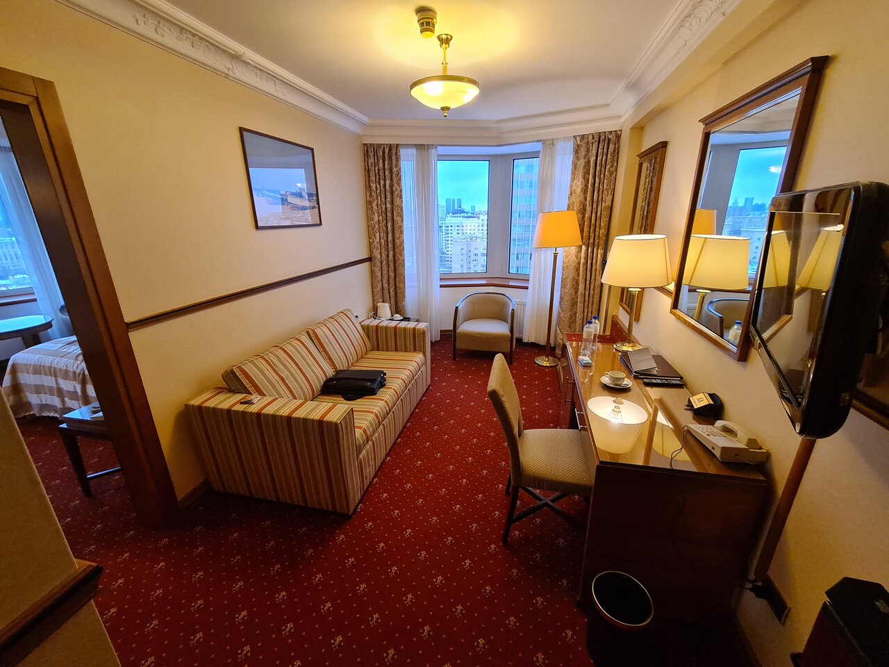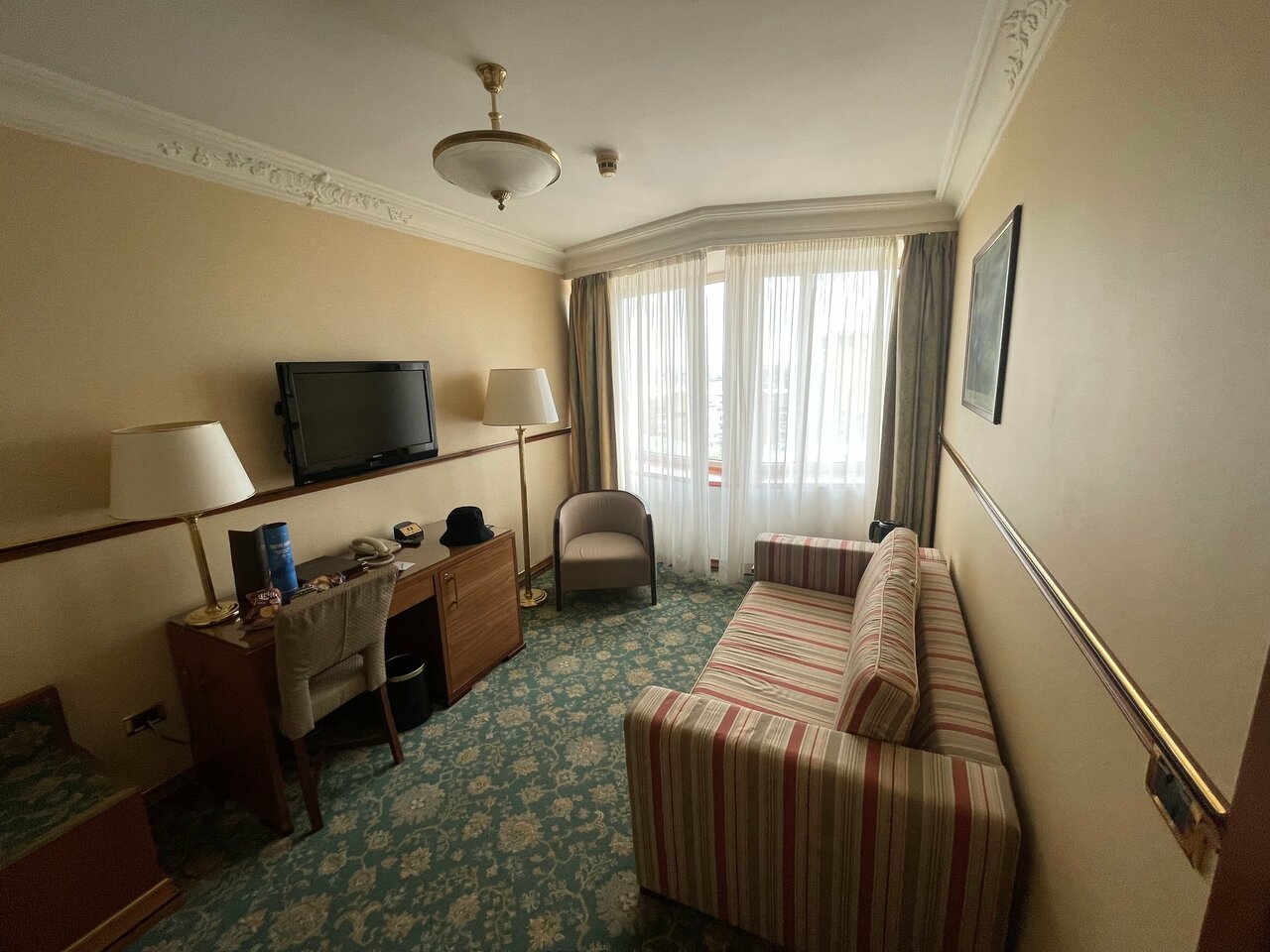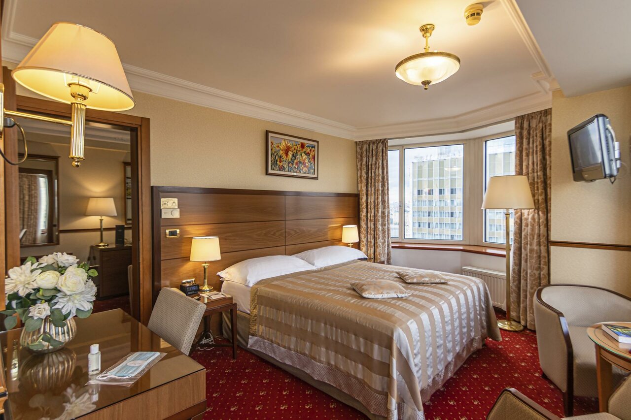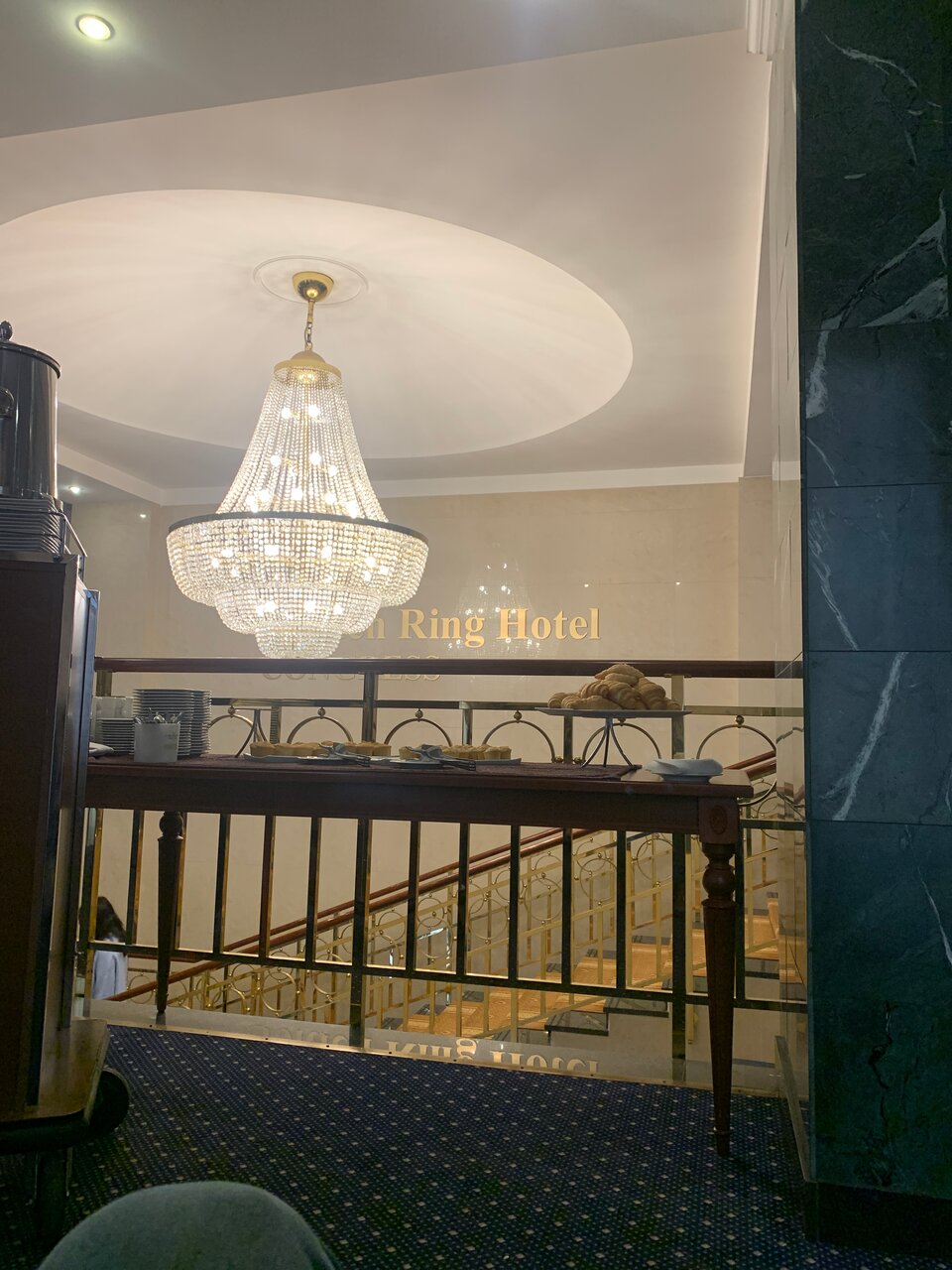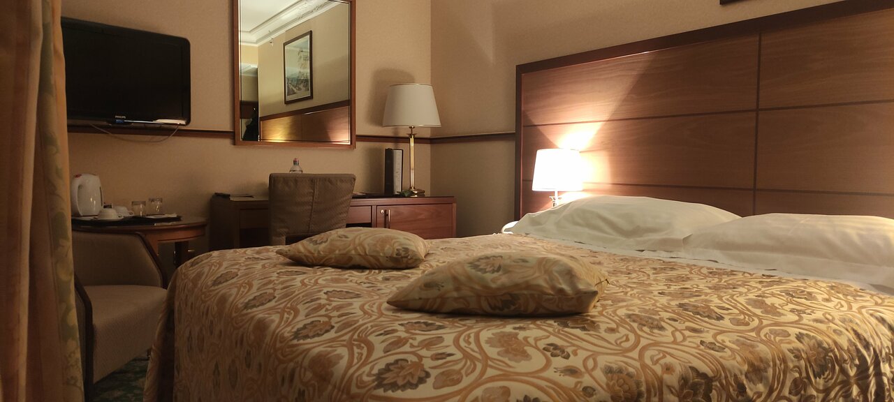 Единственный плюс это вид из окна, но слышен транспорт, даже при закрытых окнах. Еда посредственная, безвкусная, выбор не очень. Сантехника и мебель в номерах старьё. Цены сильно завышены, учитывая, что стиль, дизайн и всё что есть в номере потрёпанное, старое, требует обновления, замены, и другой цветовой гаммы. Видно, что экономят на освещении и не хватает людей в обслуге.