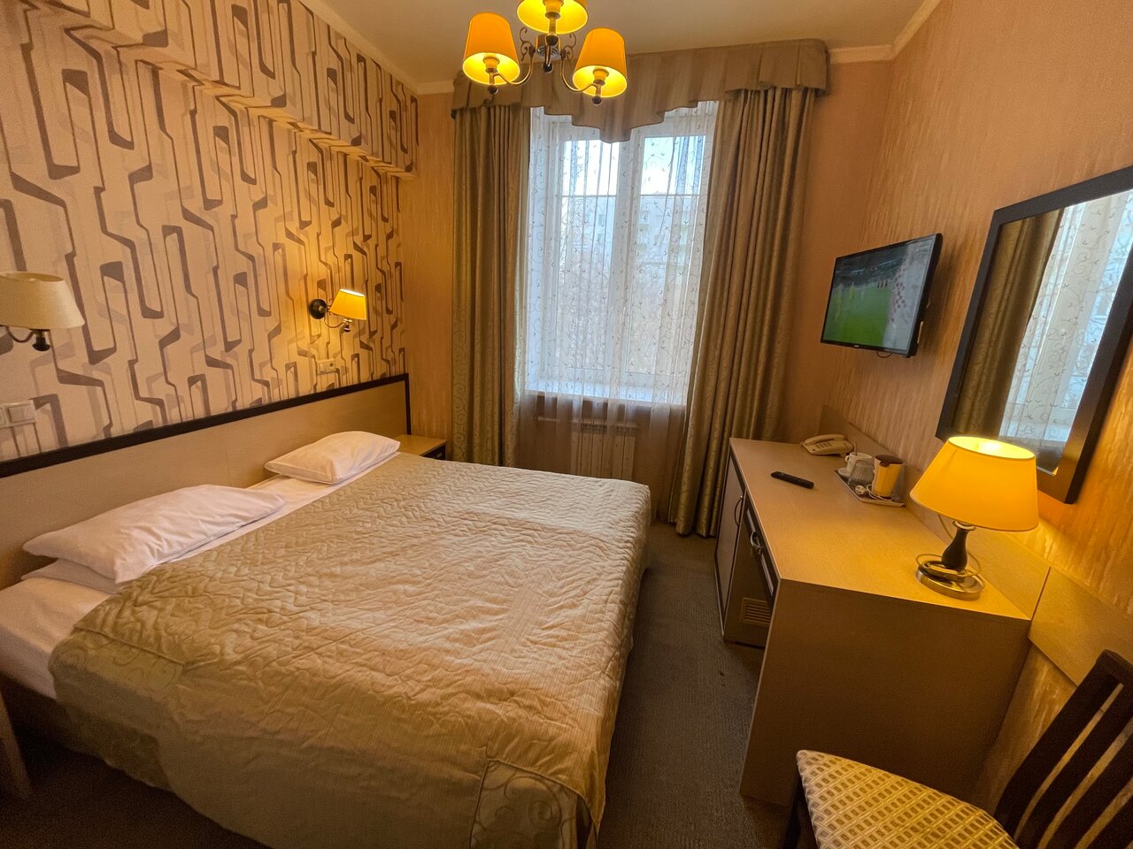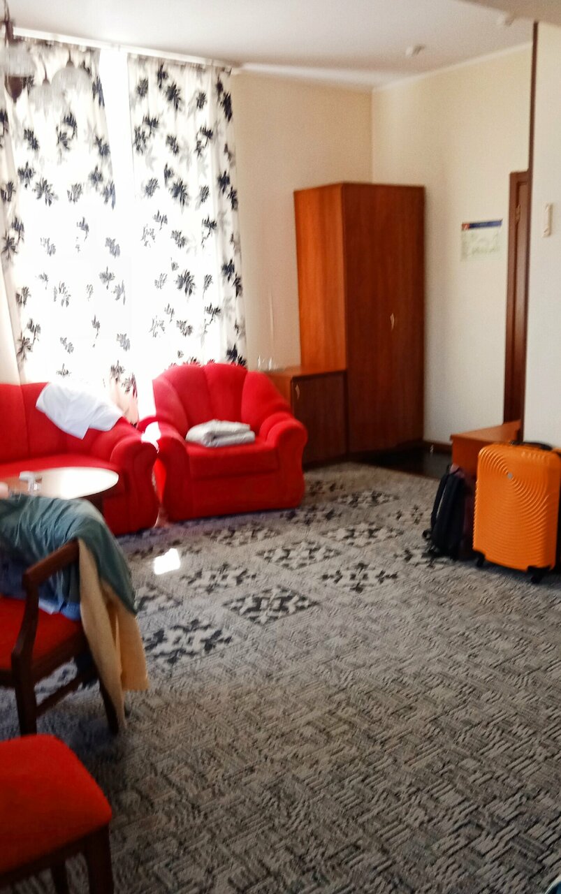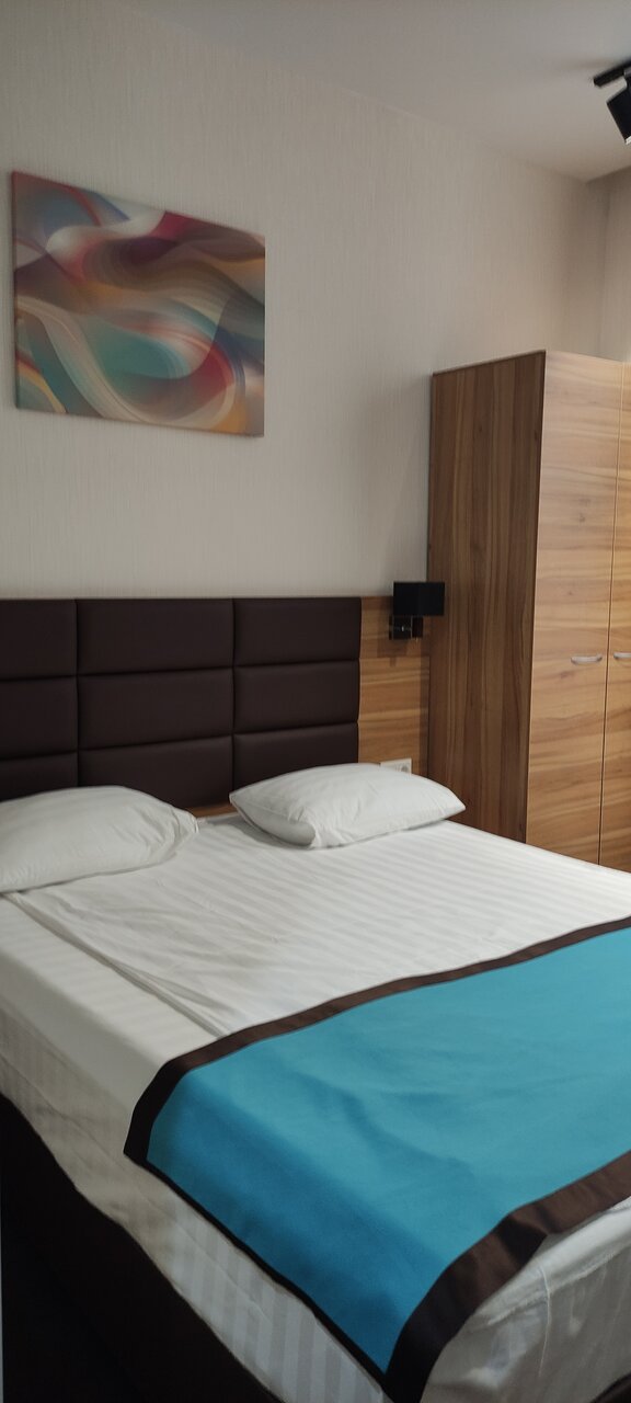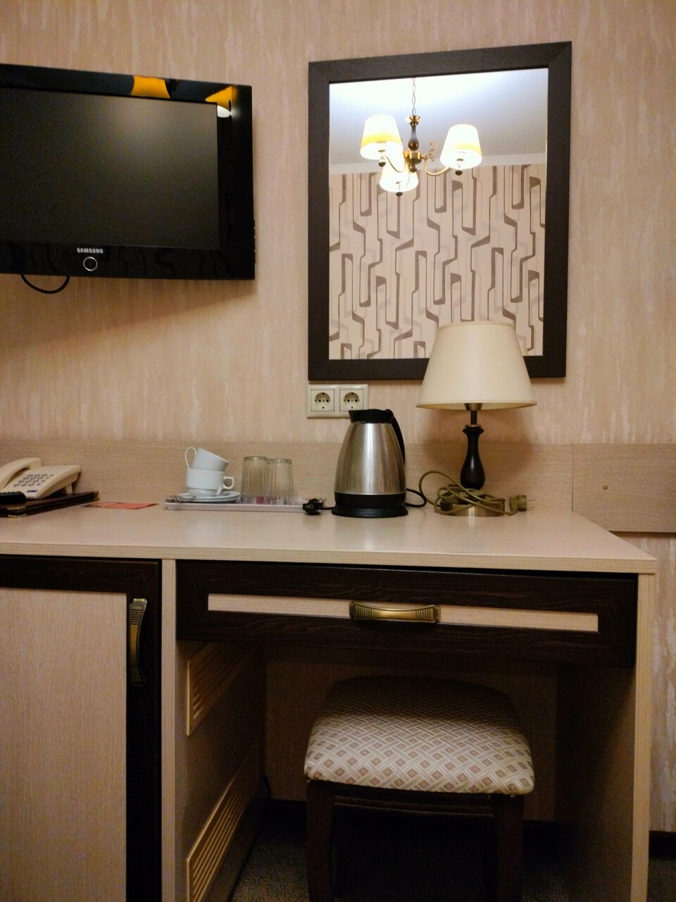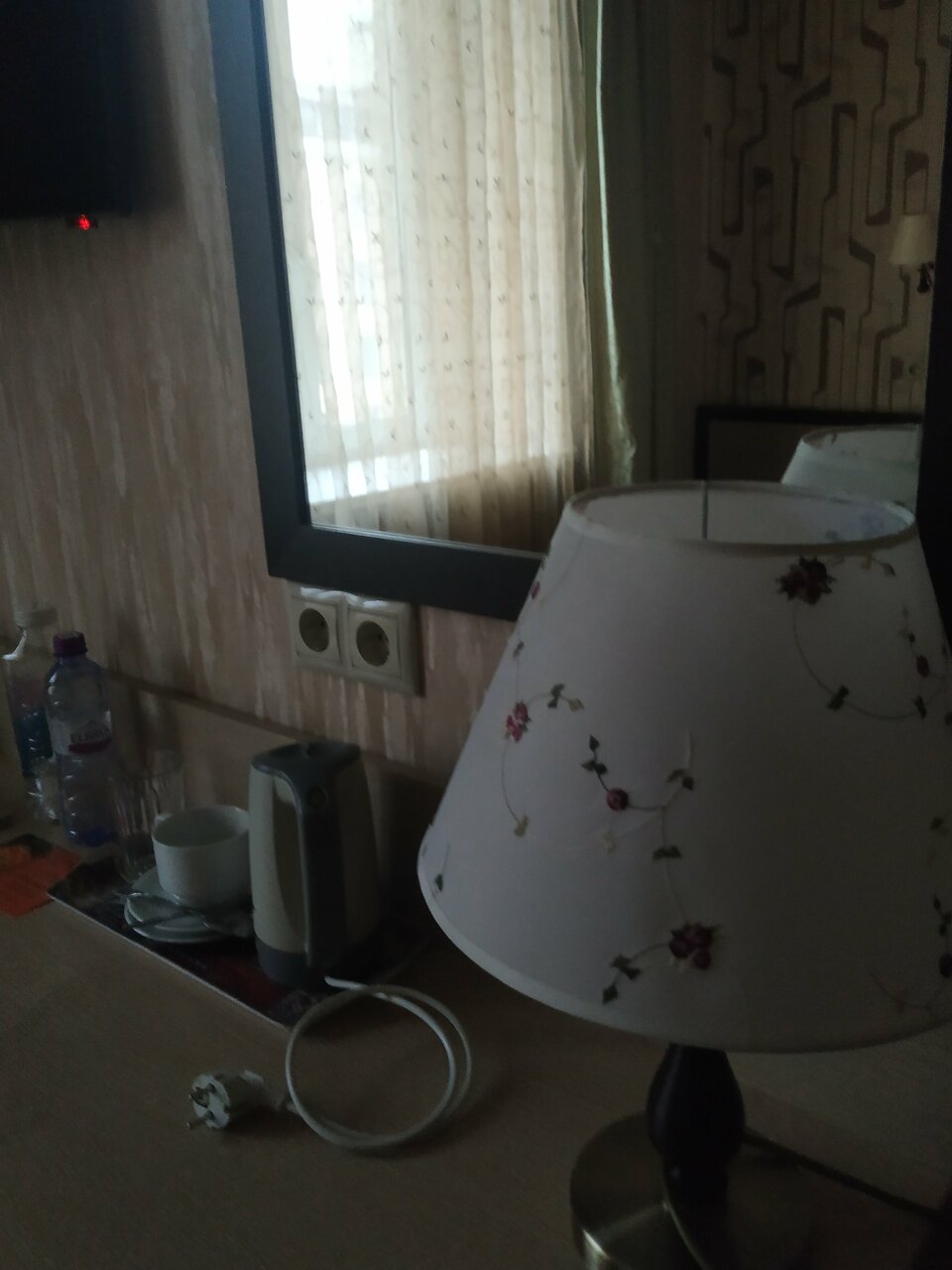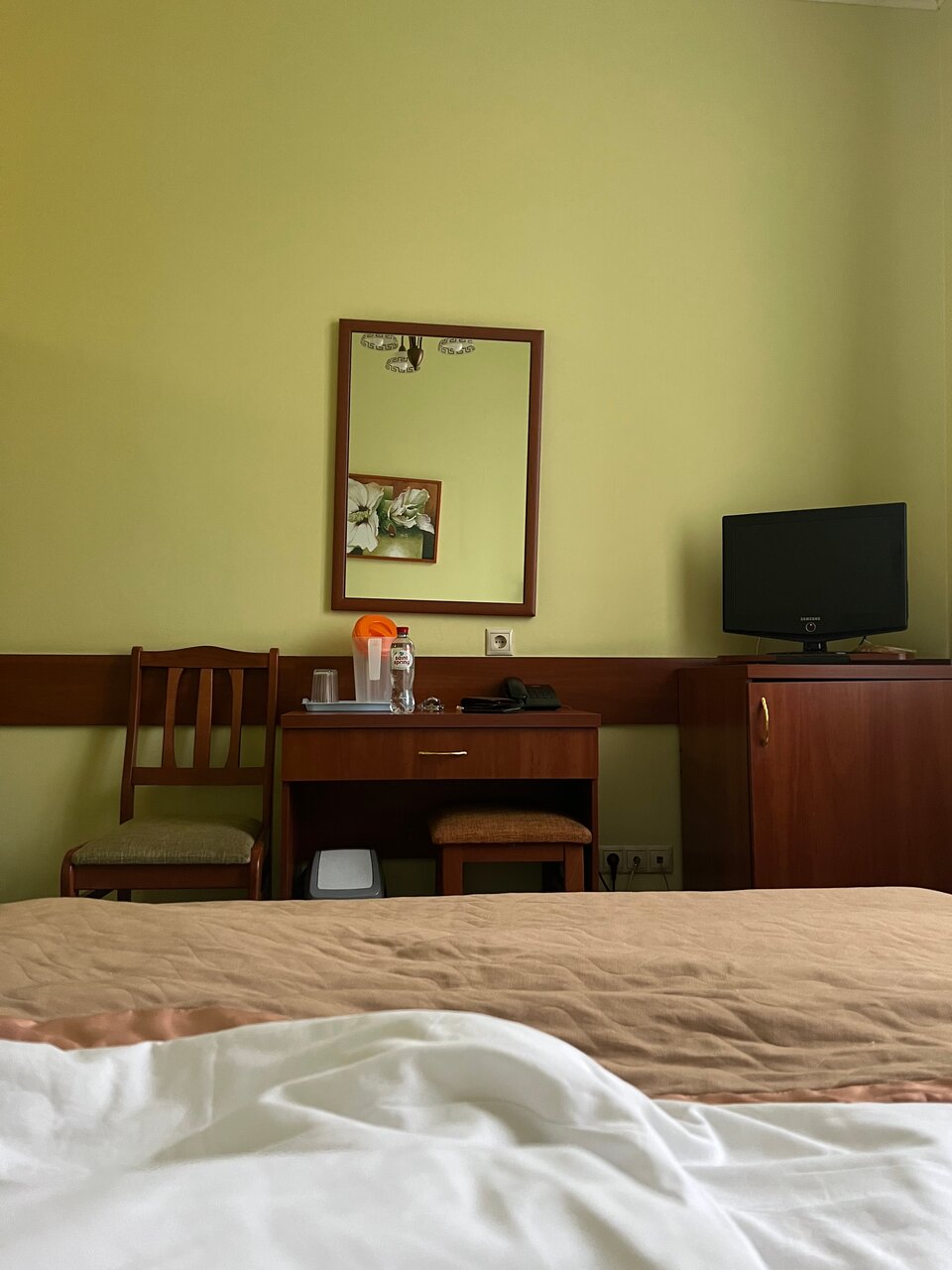 Маленький номер, чтобы переночевать подходит. Из плюсов: есть посуда,чайник, одноразовые шампунь/гель, тапочки( детских нет, на ребенка положили второй взрослый комплект) , есть рядом кафе, работающее с 8ми, можно там поесть.В номере убирают. Из минусов : в номере нет воды, кулера в отеле тоже нет. В ванной вода уходит плохо, подушка и матрас оставляют желать лучшего, вай фай сеть есть, можно подключиться, но по факту смысла нет, ничего не загружается, пользовались мобильным интернетом.
