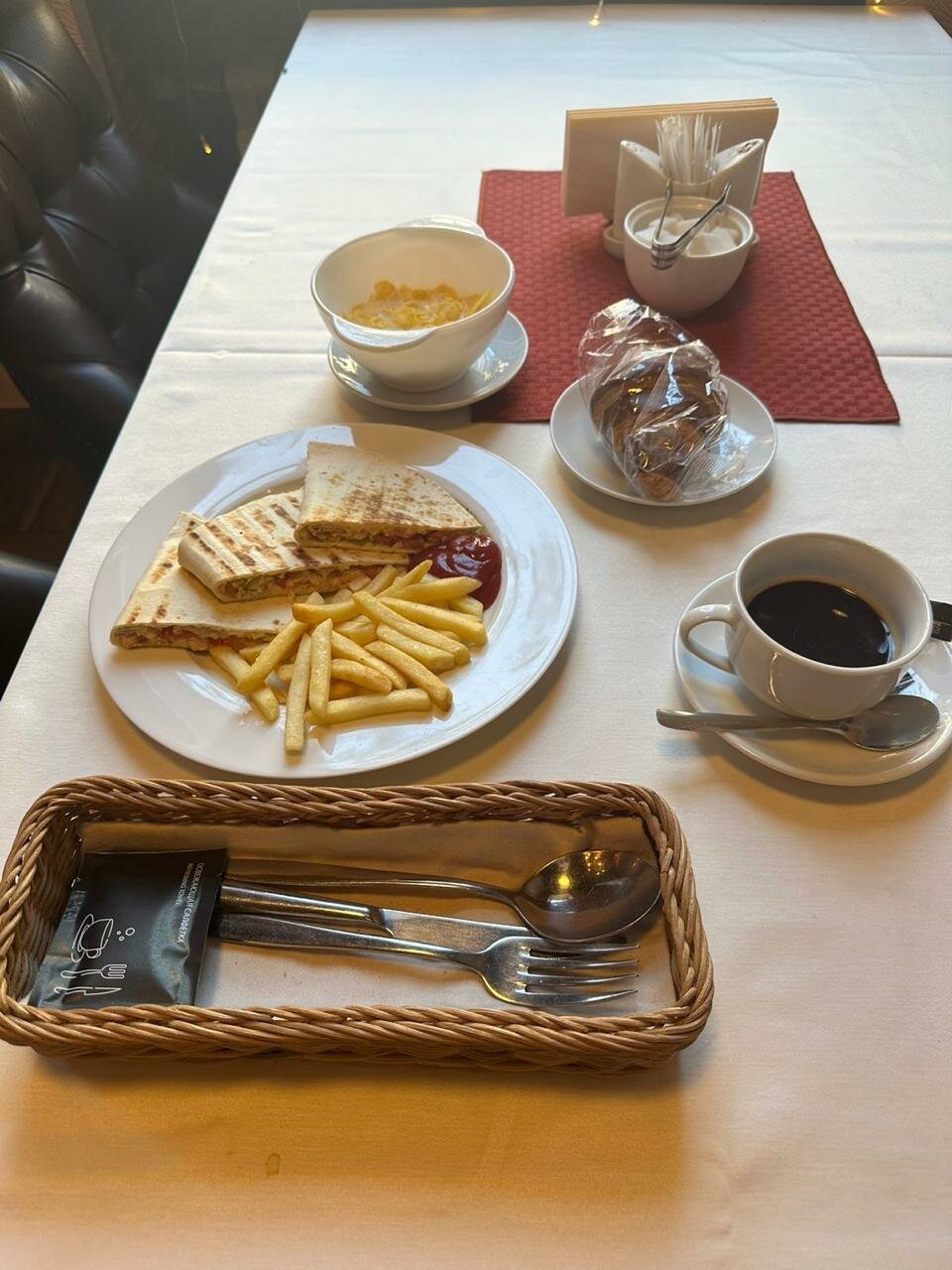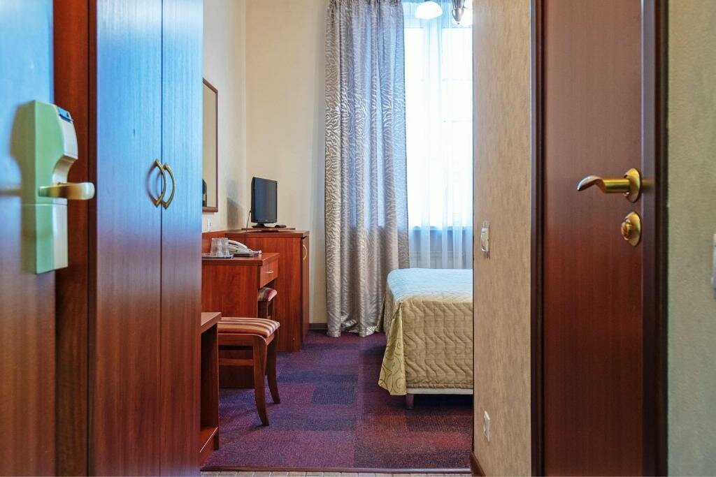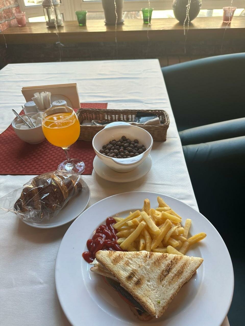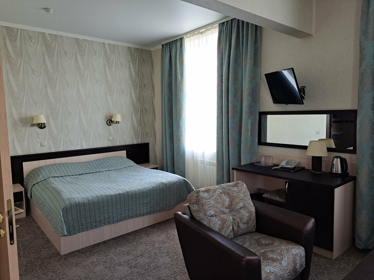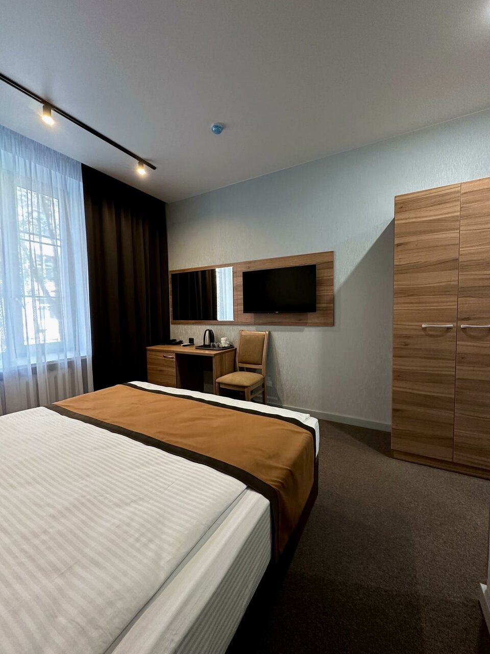 Маленький номер, чтобы переночевать подходит. Из плюсов: есть посуда,чайник, одноразовые шампунь/гель, тапочки( детских нет, на ребенка положили второй взрослый комплект) , есть рядом кафе, работающее с 8ми, можно там поесть.В номере убирают. Из минусов : в номере нет воды, кулера в отеле тоже нет. В ванной вода уходит плохо, подушка и матрас оставляют желать лучшего, вай фай сеть есть, можно подключиться, но по факту смысла нет, ничего не загружается, пользовались мобильным интернетом.
