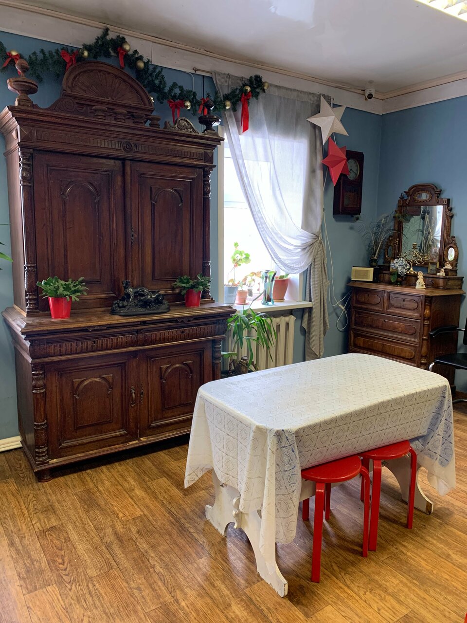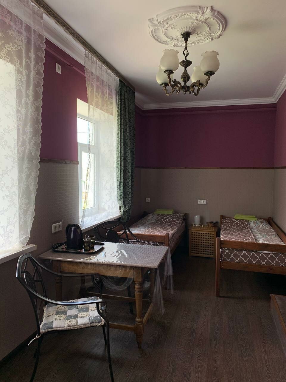 Останавливались на одну ночь. Атмосферное место, столовая как музей. Можно долго рассматривать мебель и наполнение. Или устроить фотосессию . Кухня со всем необходимым. При хорошей погоде можно воспользоваться мангалом и прокатом велосипедов. Номера маленькие,но со всем необходимым. Хорошие матрасы. Из минусов — полупрозрачные двери,свет из коридора и туалета ночью мешает.