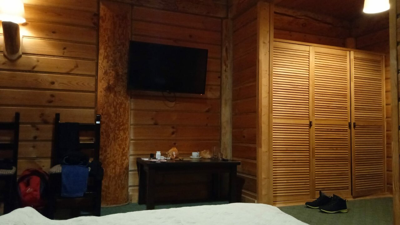 Очень понравился этот отель. Мы встретили здесь новый 2023 год. В отеле было тихо, безмятежно спокойно. Мы сняли номер люкс и вдвоем очень вольготно и уютно себя в нем чувствовали. Тепло, светло, запах дерева, красивые стены из больших брёвен с очень красивыми узорами, высокие потолки. Объем замечательный. Зал и спальня, 2 телевизора, 2 туалета, диван и кресло — кровать в зале, веранда шикарная- жаль зимой нет для нее применения, только для курящих. Парковка на территории. У нас машина прямо под окном стояла. Все уютно, даже покидать номер не хотелось. Жаль, что не было завтраков. И ресторан работал по своему загадочному графику, о котором на двери не было никаких уведомлений. На сайте, где бронировали отель, было указано — джакузи. Это удивило и рассмешило администрацию, а нас слегка огорчило.
