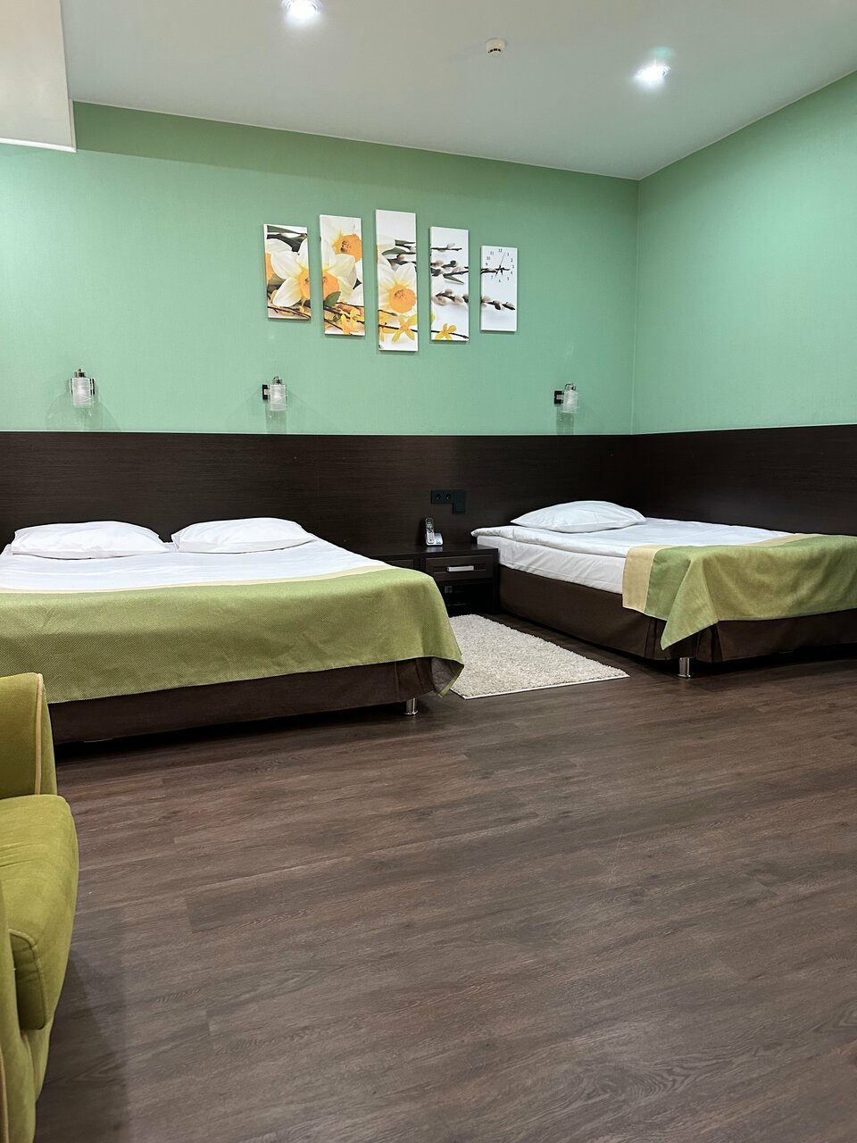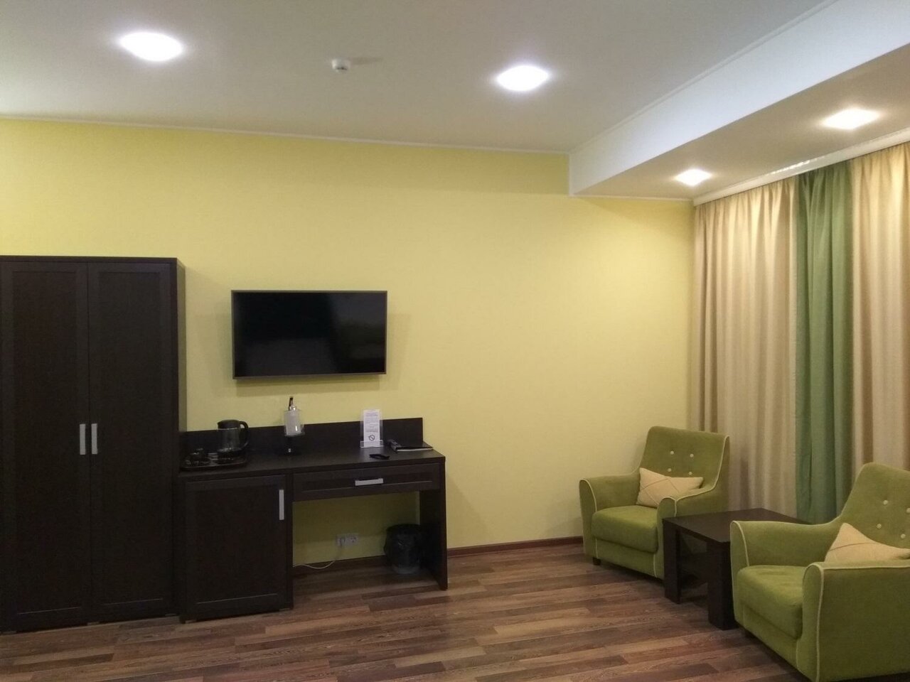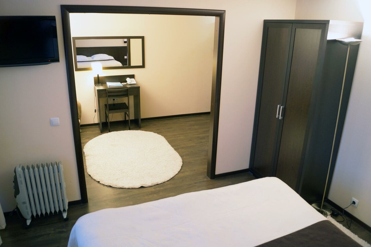 2 кровати (160*200 и 120*200) шкаф-гардеробрабочий столжурнальный стол и 2 креслателевизор 42'кабельное телевидениетелефон, чайник и холодильникпостельное белье из 100% хлопкавешалки для одежды