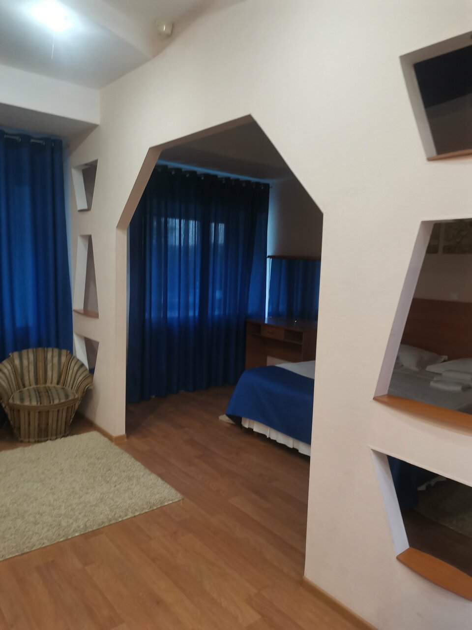Дополнительные удобства: общая кухня, фен, халаты, тапочки, камера хранения, круглосуточная стойка регистрации. Заезд — с 15:00, выезд — до 12:00.
