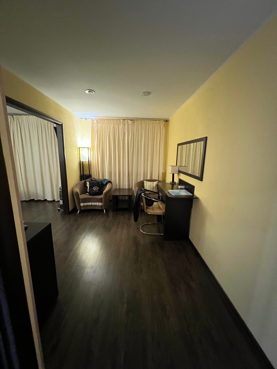 Добротный, комфортный отель немного вдали от центра. Тихо и спокойно. Одноместный номер с балконом, достаточно просторный. Есть чайник, но нет фена. Шкаф, тумбочки, есть куда разложить вещи. Неплохое кафе, шведский стол на завтрак весьма аскетичный. Но в целом очень неплохое впечатление.