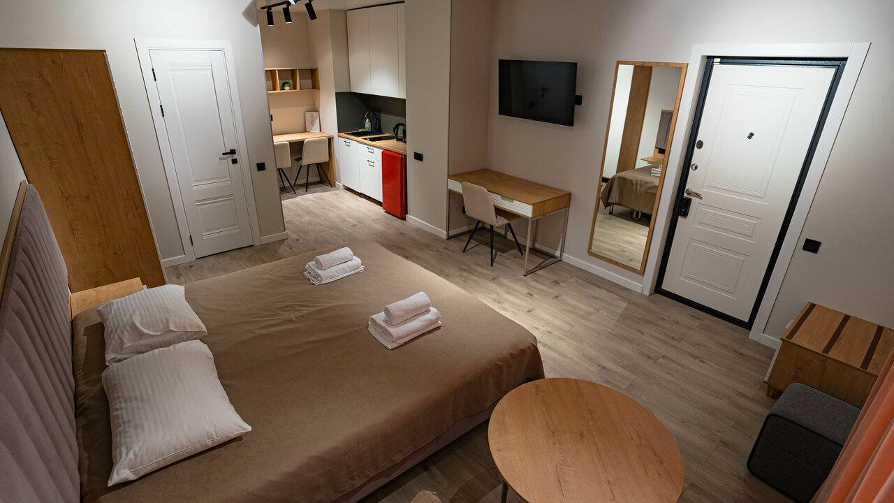 - Уютный номер.; Ресторан с аутентичной кухней рядом.; Наличие необходимой техники (чайник, холодильник, фен).; Электронный замок (удобство самостоятельного заселения).; Удобное расположение в центре.