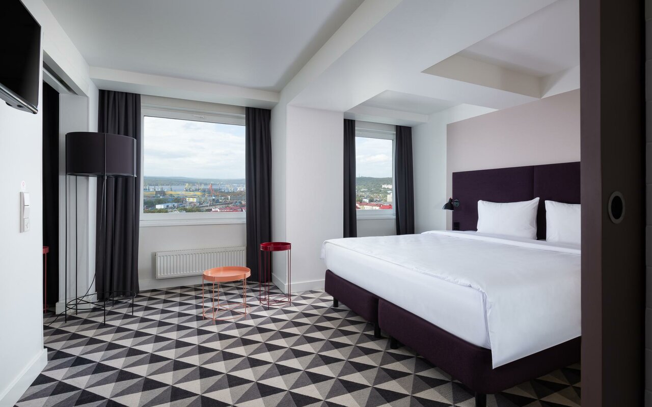 Номер повышенной комфортности с двуспальной кроватью, оборудованный рабочим местом, просторной ванной комнатой и гладильной станцией. Номера расположены на верхних этажах отеля — из окон открывается красивый панорамный вид на город.