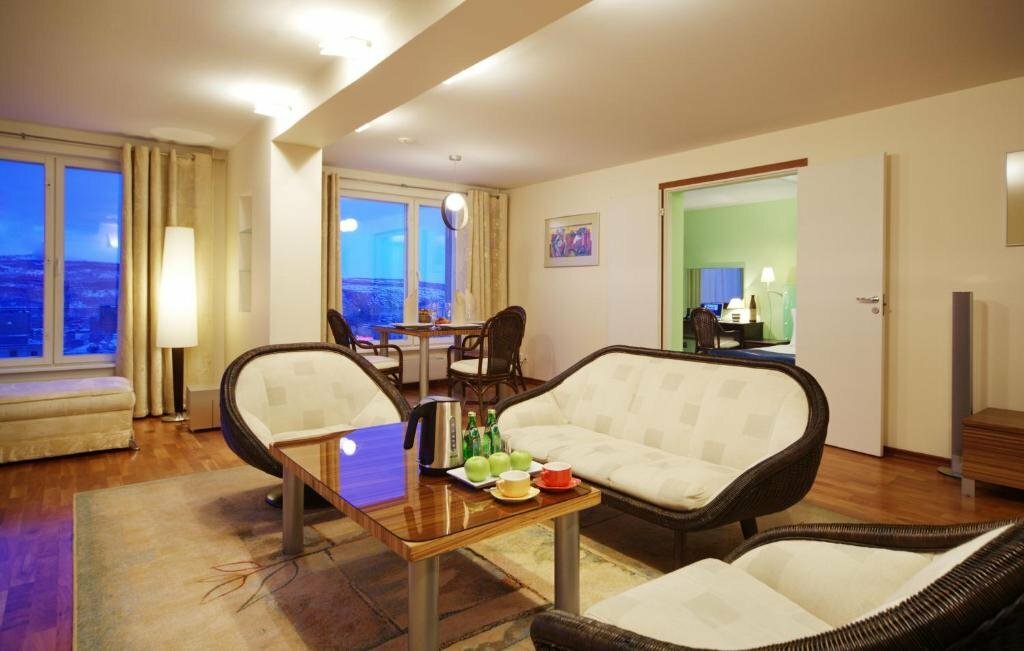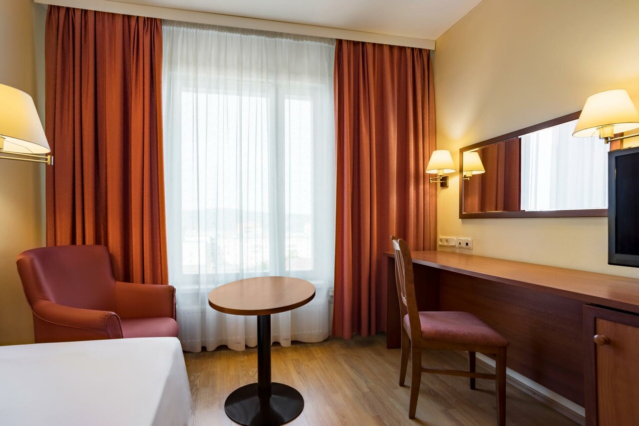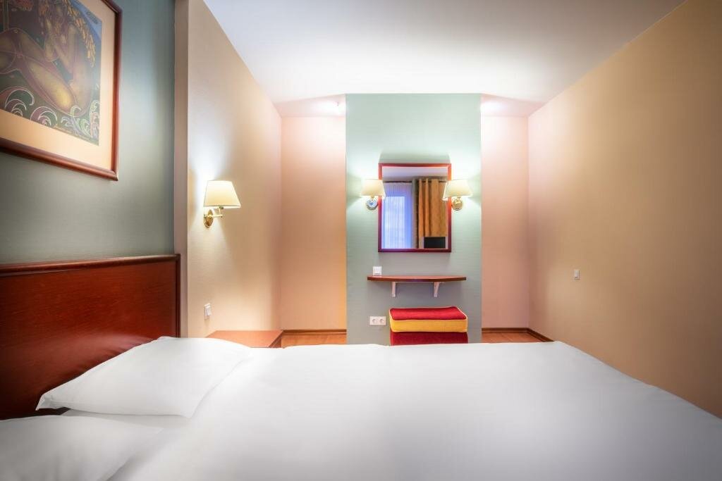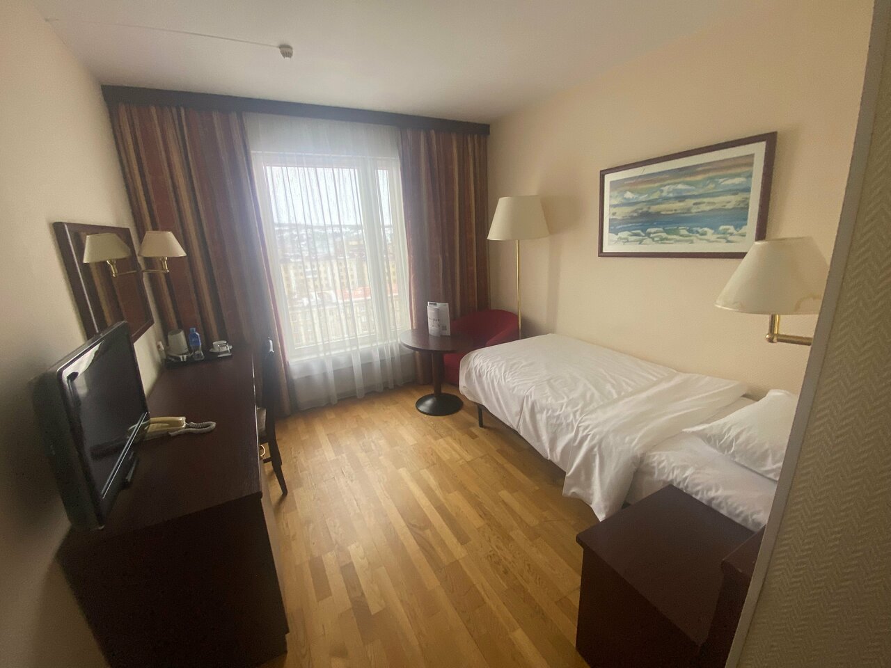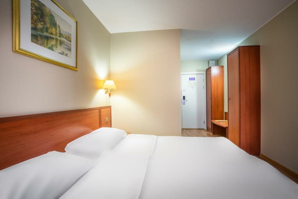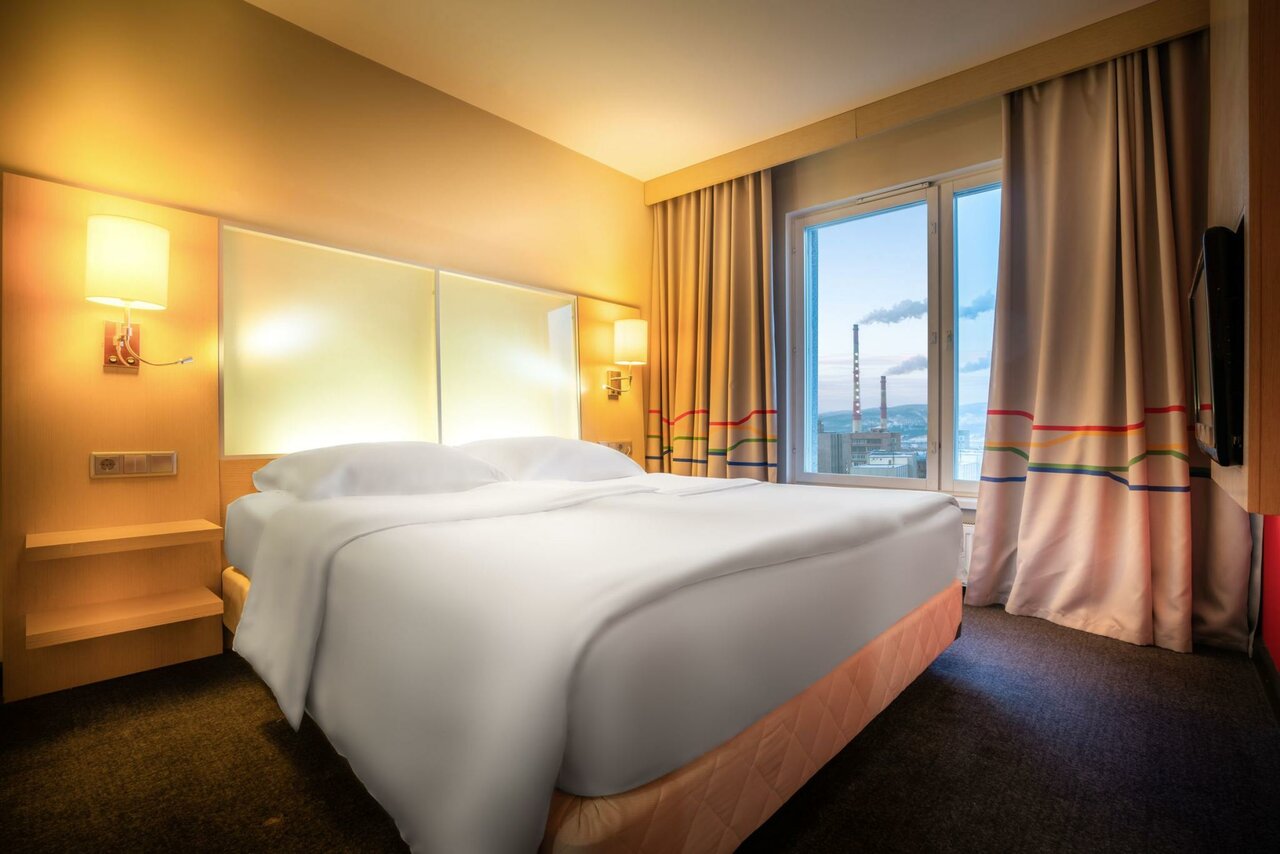 Отель очень старый, расположение и вид из окна карец. Ванна с порогом, чуть не разбился спросони. 20см как минимум, осторожней. Ковролина нет в номере. В кородоре совковмкий ковролин красный в горошек. Поставил бы ниже, но мелочи помогли, зонт дали в город бесплатно[прилетел из 22 гр как раз в 3 град в пургу и снег, оч помогли зонтом рецепшн], заселили пораньше, выселился в 2 без проблем, а не в 12, завтрак норм лопнуть можно и смущи даже есть. Ночи еще белые , в 12 светит солнышко. Бар рядом крудка норм тоже. Так что четвербан по совокупности. Ремонтик бы еще. Ценрик под 5 вроде за сутки. Кровать и матрац средней удобности.