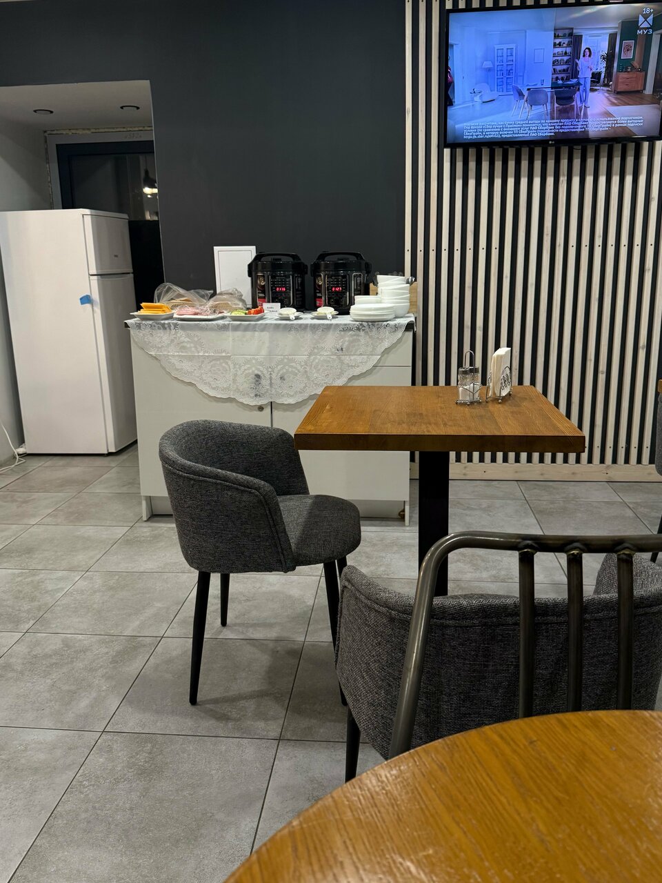 Это не гостиница, а скорее комнаты в аренду. Безконтактное заселение. Если у вас сел телефон, то вы врятли сюда попадете. По телефону общение не особо доброжелательное. В комнате на подокойнике черные волосы. В мусорке в туалете используемая туалетка лежала, ободок унитаза как будто по нему ногами прошлись ну или что-то грязное поставили. На столе есть чай, сахар в пакетиках, две кружки, чайник. Заварка одна вскрыта. Ни каких ключей, все по коду проходить. В номер тоже кодовый замок. На кухне кулер с водой, хлопья для завтрака. Посуда разная, плиты нет. Чай, сахар есть.