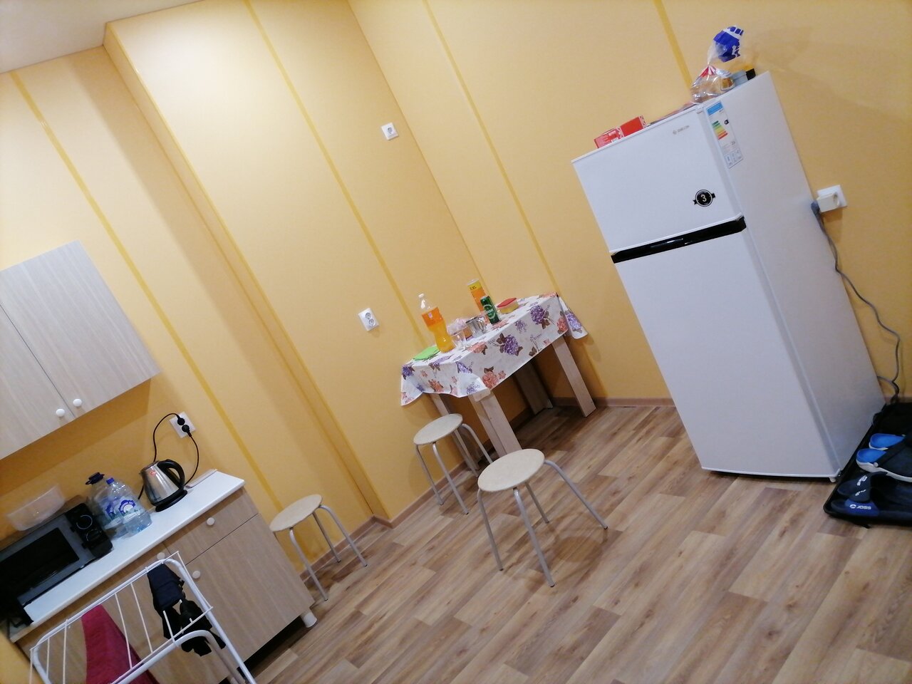 Приехали по работе и жили в рабочем хостеле ,так как это по работе условия внутри хорошие ,кухня,комната отдельная ,туалет душа номере ,спокойно для командировочных очень достойно .