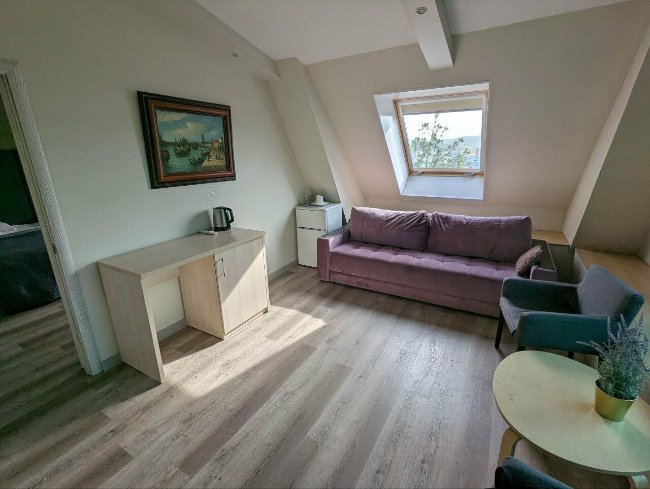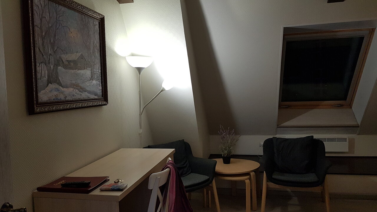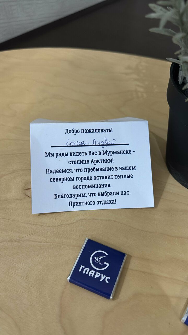 Отель очень понравился, большой уютный двухместный номер, прекрасный тропический душ и удивительно вкусный запах мыла. Очень вкусный кофе (машина Delongi),есть и сливки, и щедро нарезанный лимон, корзина свежих яблок. Но! В завтрак-блины, сосиськи-нужно доводить до ‘ума’- полуфабрикат. Не комильфо!!! И ещё один небольшой минус-для оооочень уставших от путешествия по всему Кольскому полуострову за 8 дней-подняться на 3-ий этаж без лифта с тяжёлыми вещами-проблемка!!!
