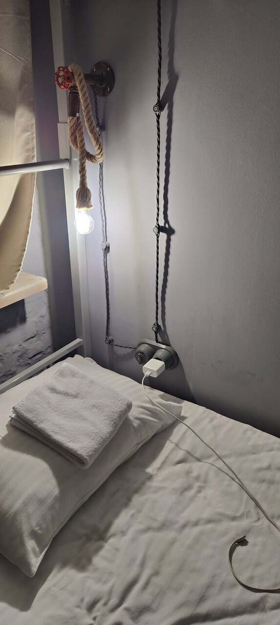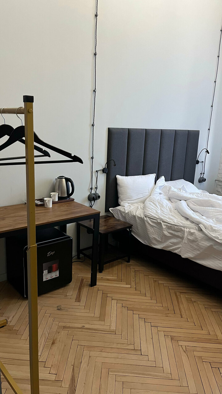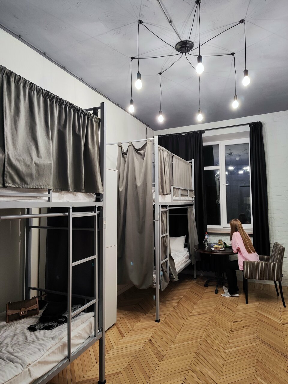 Хороший вариант, если нужно провести одну ночь ( говорю про часть, относящуюся к хостелу). Нет претензий ни к чистоте, ни к новизне обстановки, ни к расположению (недалеко от вокзала). Замечательная идея создать личное пространство для каждого с помощью штор на кровати. Но : кровать скрипела от малейшего вздоха, не то что движения; дверь скрипела чуть поменьше. Также на кухне очень мало места для того, чтобы присесть и поесть: узкая барная стойка с 3мя табуретами и два мягких стула. В комнате есть стол, но почему-то всего один стул. Для меня, во всяком случае , хостел это не только место где можно поспать, но и пообщаться с людьми, и приготовить еду, чтобы там же её съесть с достаточным комфортом. Хотя, возможно, я и ошибаюсь в чём — то.