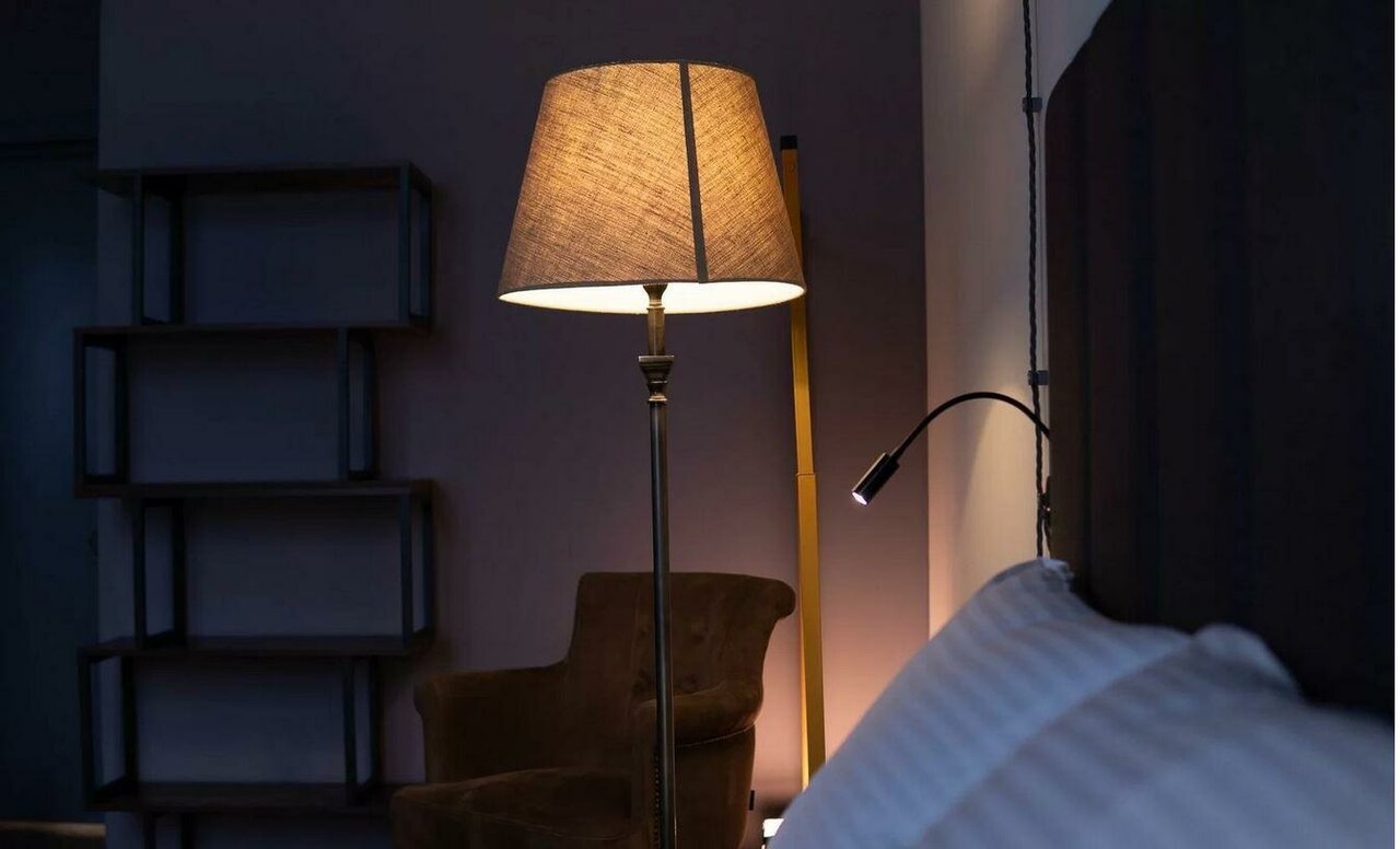 Роскошный номер с дизайнерским интерьером и со всем необходимым для комфортного размещения. В номере большая двухместная кровать с очаровательными ночниками, уютный диван и кресло.