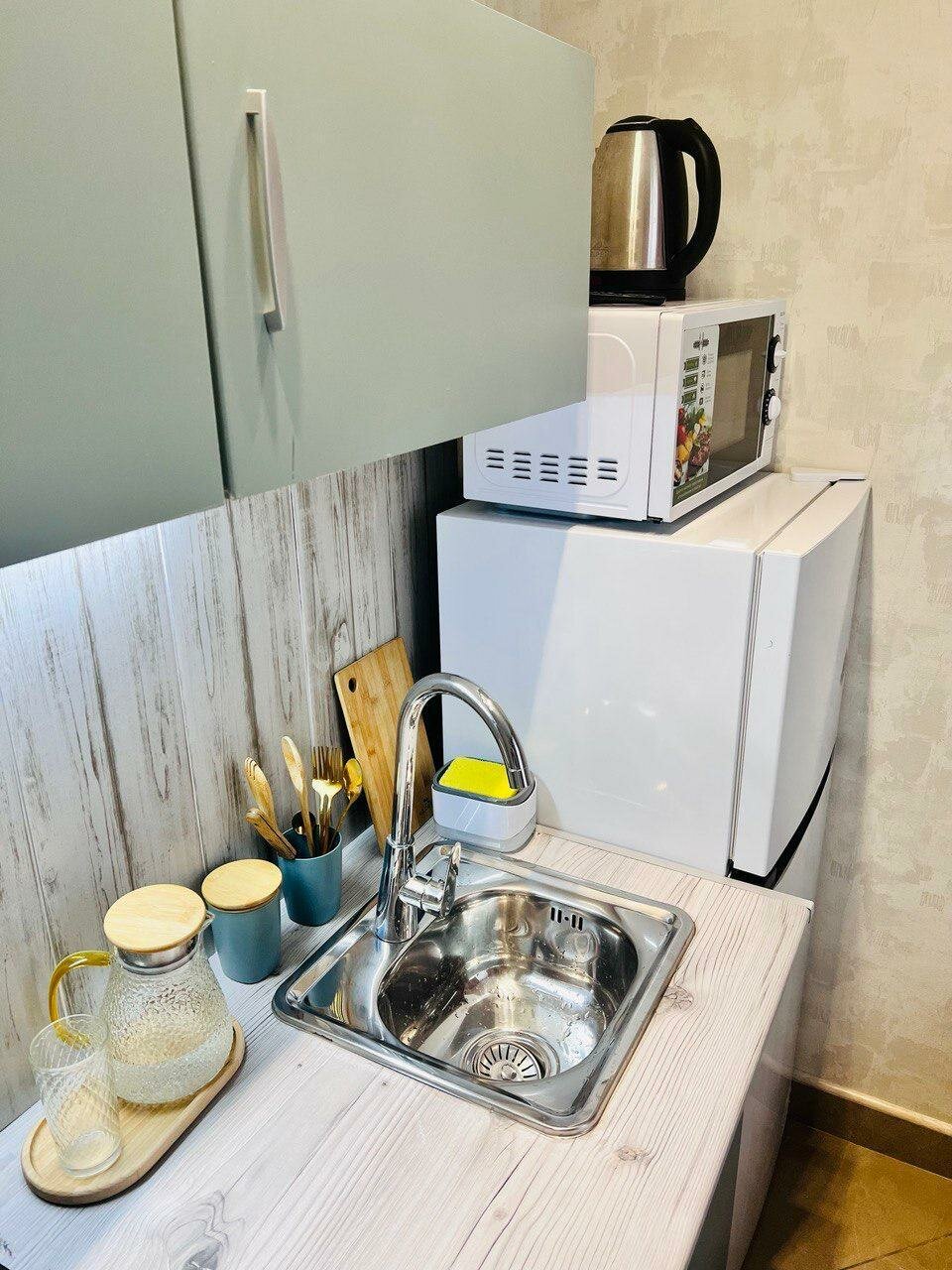 - Наличие мини-кухни и необходимой техники (чайник, микроволновка, плита, стиральная машина).