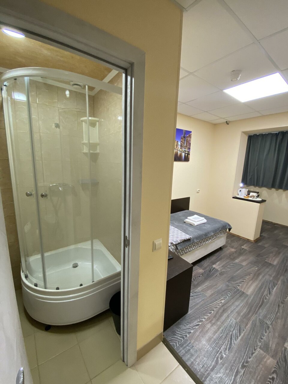 Хорошая гостиница, кухня общая, но в номере есть чай и чайник. Дают одноразовые тапочки, шампунь, гель. До центра минут 15 на машине