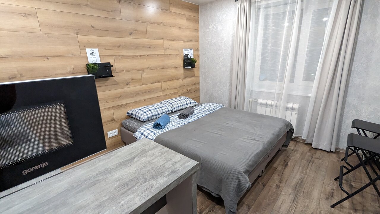 Очень уютно, есть где приготовить еду, чисто и аккуратно. Не жалеют гель для душа и шампунь. Удобная кровать, большой телевизор. Самое главное прсуда, микроволновка, холодильник, плита и все в номере